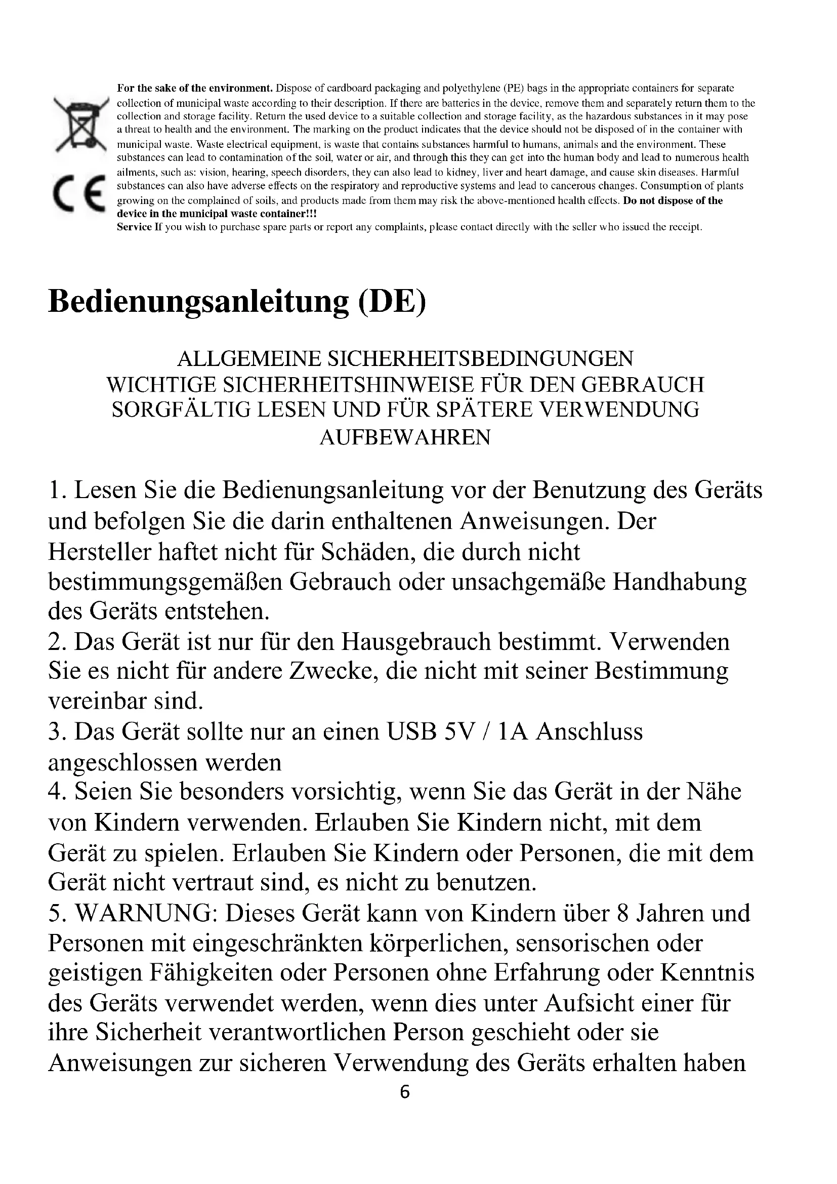 5. WARNUNG: Dieses Gerät kann von Kindern über 8 Jahren und