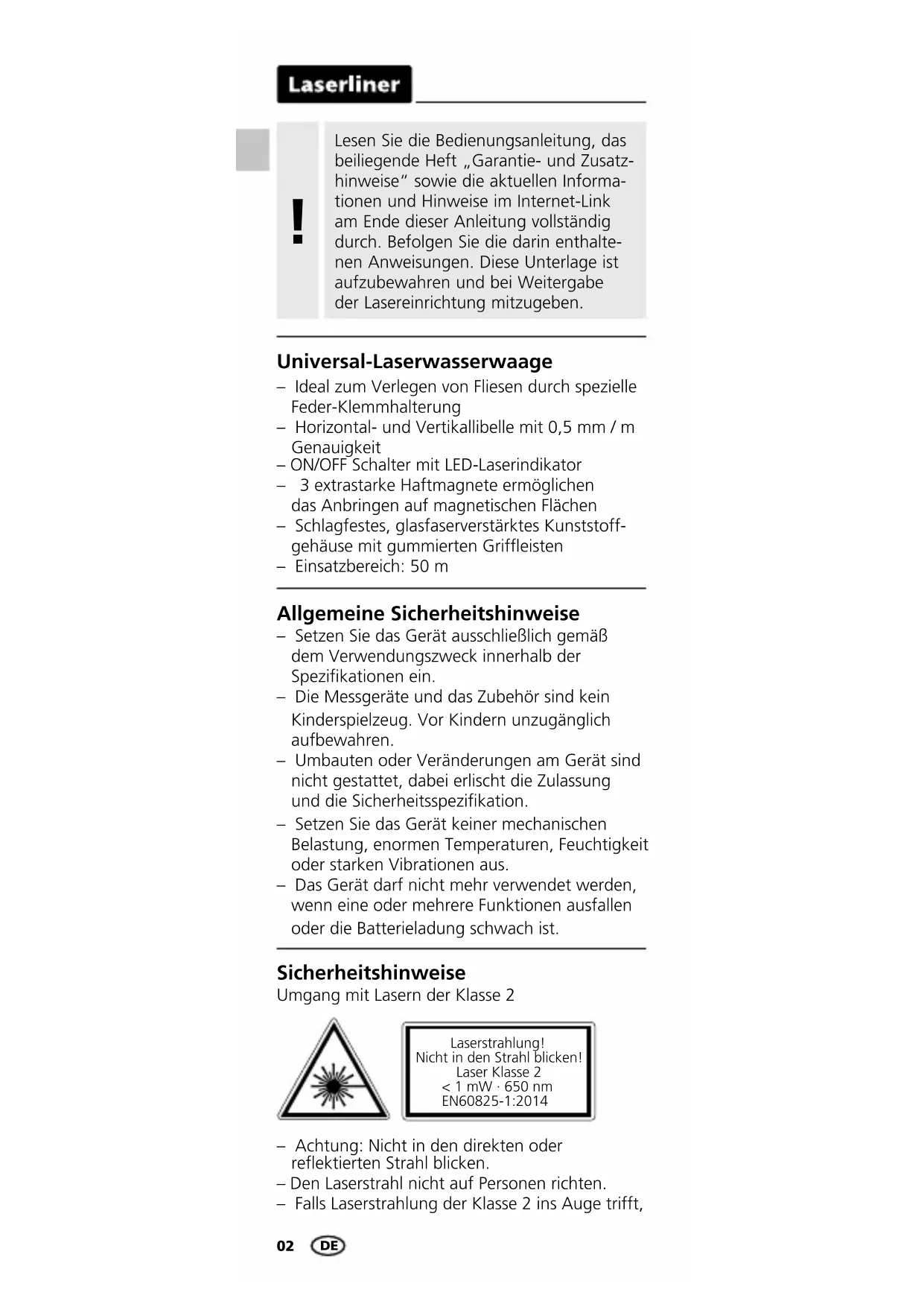 Laser 650 nm02 Lesen Sie die Bedienungsanleitung, das beiliegende Heft „Garantie- und Zusatz- hinweise“ sowie die aktuellen Informa- tionen und Hinweise im Internet-Link am Ende dieser Anleitung vollständig durch. Befolgen Sie die darin enthalte- nen Anweisungen. Diese Unterlage ist aufzubewahren und bei Weitergabe der Lasereinrichtung mitzugeben.