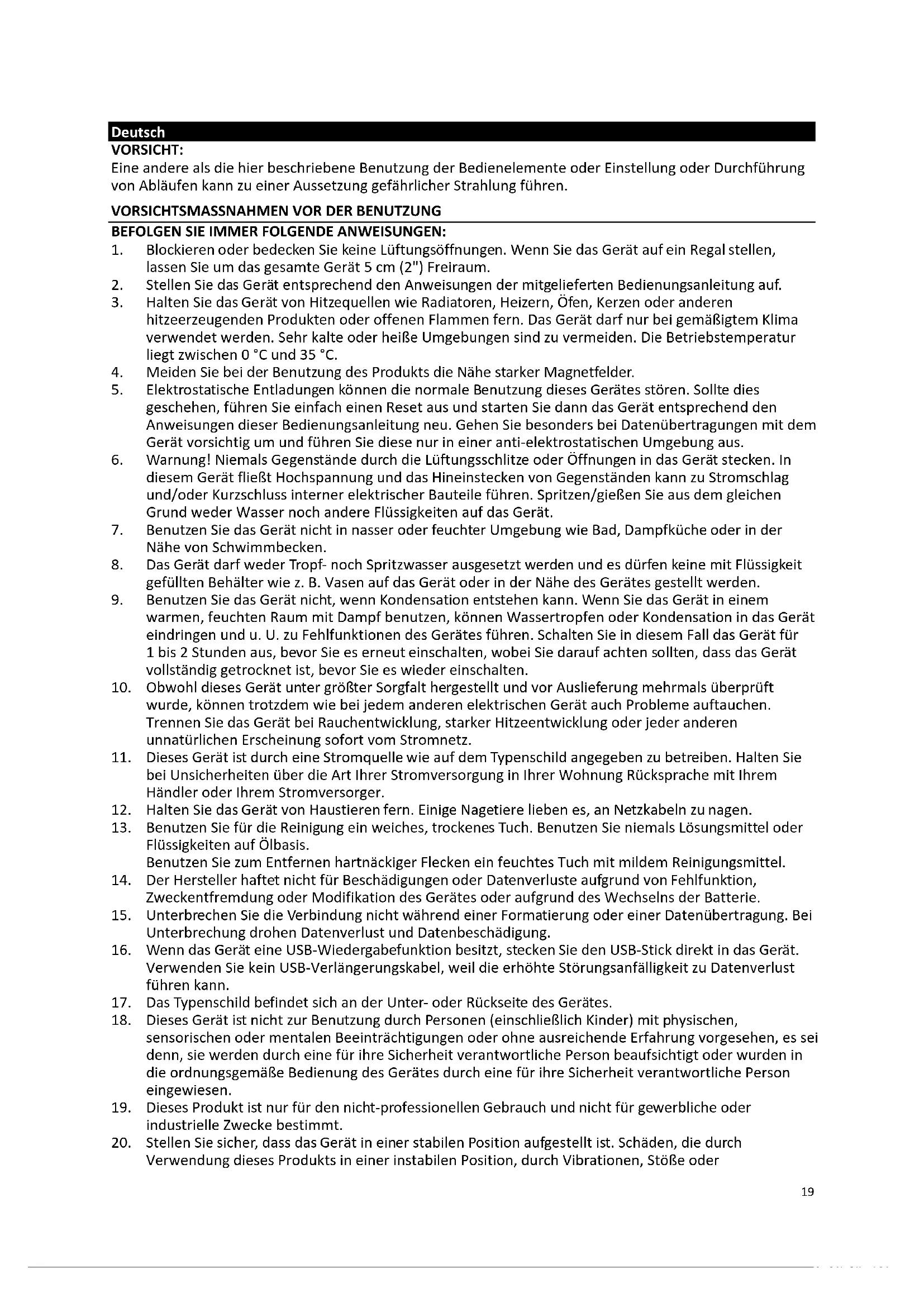 19. Dieses Produkt ist nur für den nicht-professionellen Gebrauch und nicht für gewerbliche oder