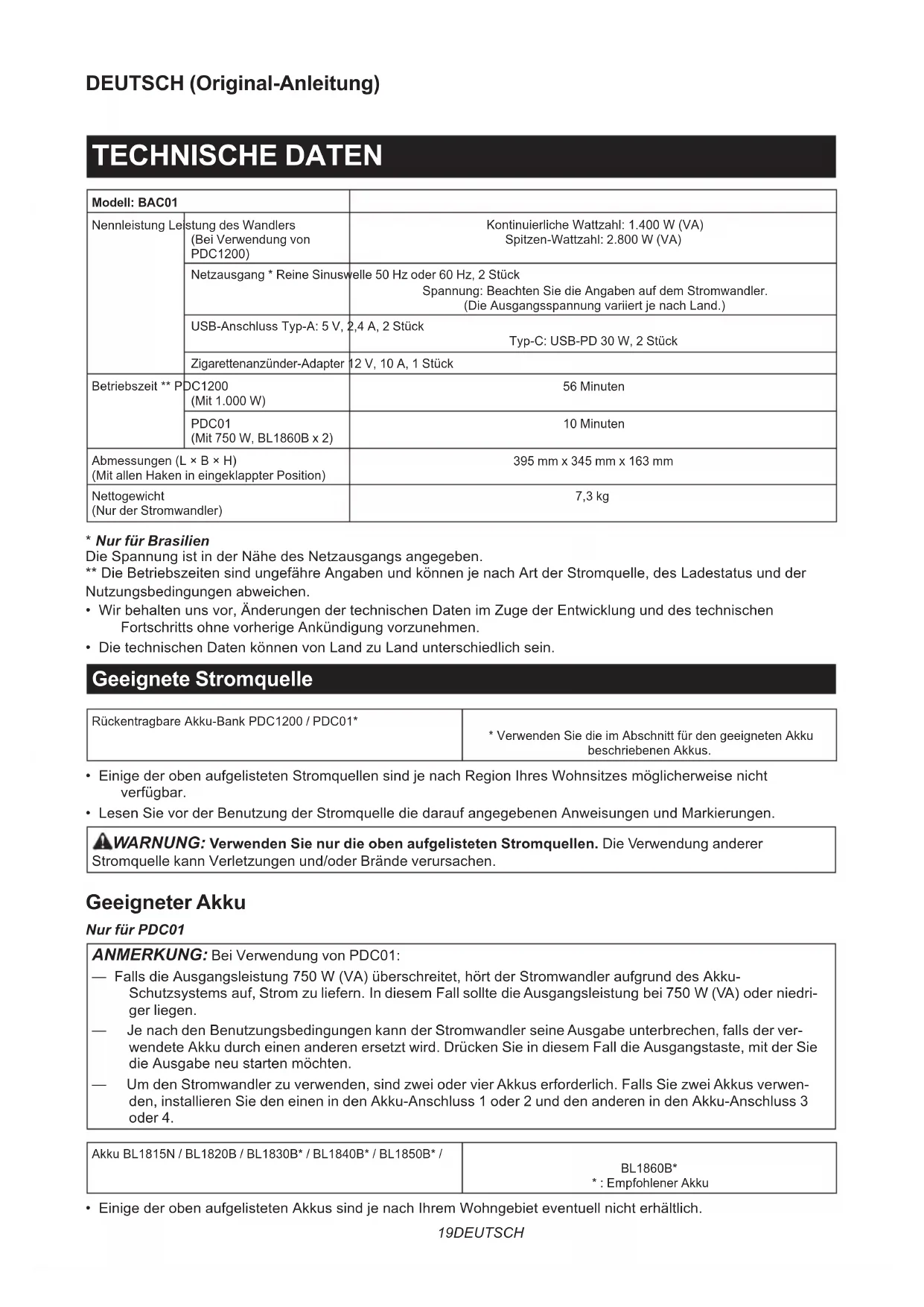 - Die technischen Daten können von Land zu Land unterschiedlich sein. Geeignete Stromquelle Rückentragbare Akku-Bank PDC1200 / PDC01*