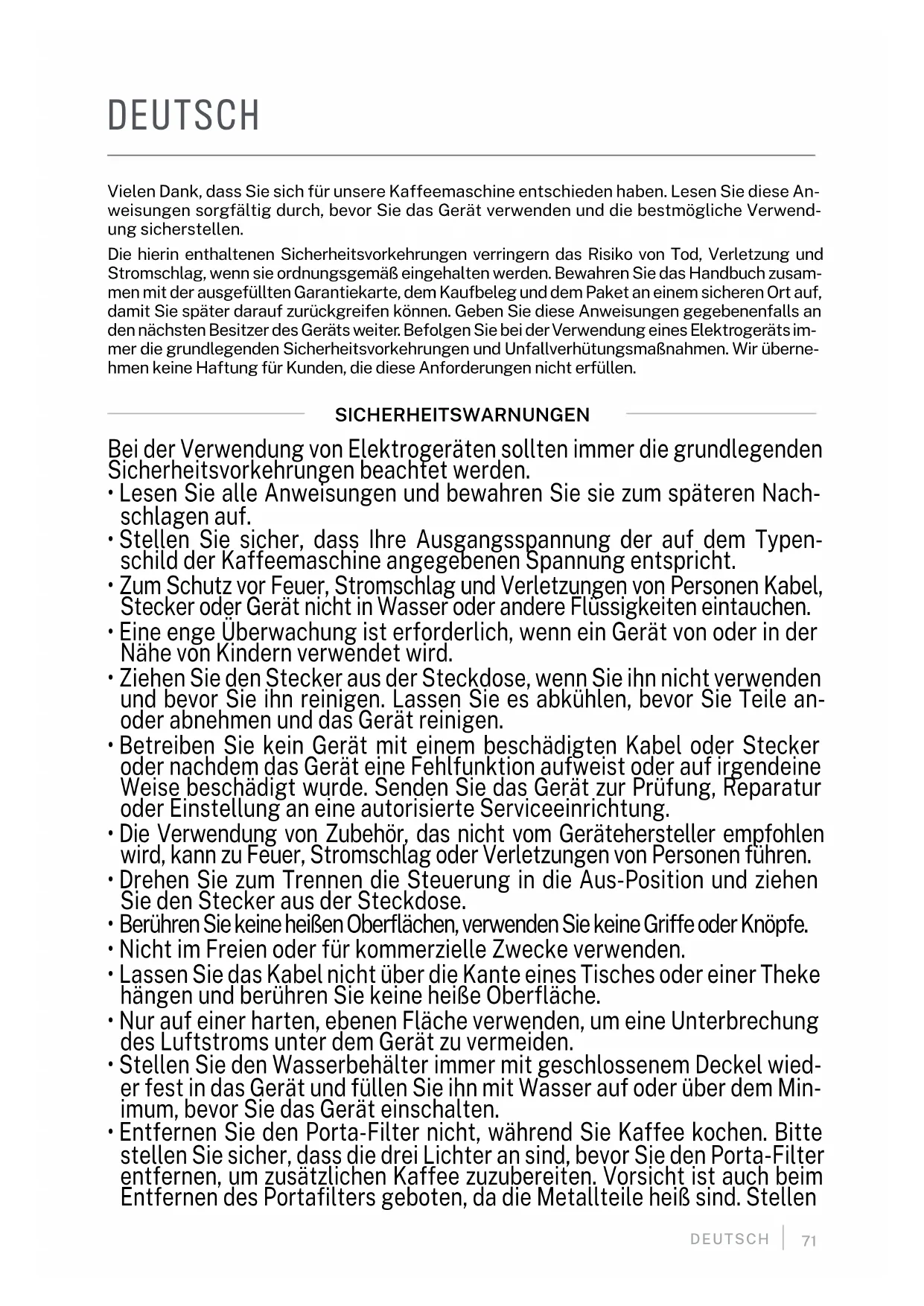 Le tre spie del pannello di controllo lampeggiano alterna- tivamente. Il serbatoio dell'acqua è fuori dall'acqua. Aggiungere l'acqua al serba- toio.71 DEUTSCH DEUTSCH SICHERHEITSWARNUNGEN Vielen Dank, dass Sie sich für unsere Kaffeemaschine entschieden haben. Lesen Sie diese An- weisungen sorgfältig durch, bevor Sie das Gerät verwenden und die bestmögliche Verwend- ung sicherstellen. Die hierin enthaltenen Sicherheitsvorkehrungen verringern das Risiko von Tod, Verletzung und Stromschlag, wenn sie ordnungsgemäß eingehalten werden. Bewahren Sie das Handbuch zusam- men mit der ausgefüllten Garantiekarte, dem Kaufbeleg und dem Paket an einem sicheren Ort auf, damit Sie später darauf zurückgreifen können. Geben Sie diese Anweisungen gegebenenfalls an den nächsten Besitzer des Geräts weiter. Befolgen Sie bei der Verwendung eines Elektrogeräts im- mer die grundlegenden Sicherheitsvorkehrungen und Unfallverhütungsmaßnahmen. Wir überne- hmen keine Haftung für Kunden, die diese Anforderungen nicht erfüllen. Bei der Verwendung von Elektrogeräten sollten immer die grundlegenden Sicherheitsvorkehrungen beachtet werden.