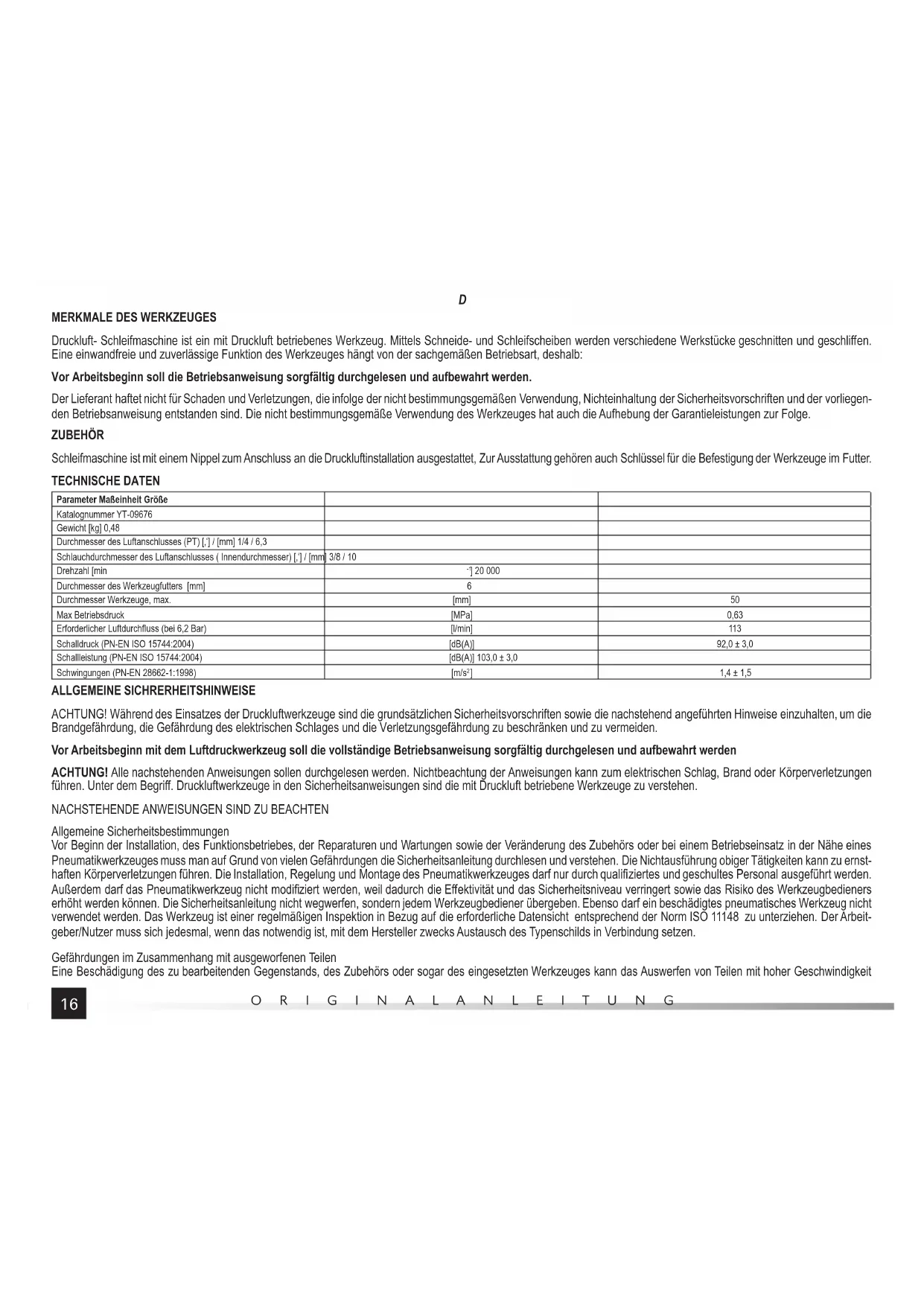 Druckluft- Schleifmaschine ist ein mit Druckluft betriebenes Werkzeug. Mittels Schneide- und Schleifscheiben werden verschiedene Werkstücke geschnitten und geschliff en. Eine einwandfreie und zuverlässige Funktion des Werkzeuges hängt von der sachgemäßen Betriebsart, deshalb: Vor Arbeitsbeginn soll die Betriebsanweisung sorgfältig durchgelesen und aufbewahrt werden. Der Lieferant haftet nicht für Schaden und Verletzungen, die infolge der nicht bestimmungsgemäßen Verwendung, Nichteinhaltung der Sicherheitsvorschriften und der vorliegen- den Betriebsanweisung entstanden sind. Die nicht bestimmungsgemäße Verwendung des Werkzeuges hat auch die Aufhebung der Garantieleistungen zur Folge. ZUBEHÖR Schleifmaschine ist mit einem Nippel zum Anschluss an die Druckluftinstallation ausgestattet, Zur Ausstattung gehören auch Schlüssel für die Befestigung der Werkzeuge im Futter. TECHNISCHE DATEN Parameter Maßeinheit Größe Katalognummer YT-09676 Gewicht [kg] 0,48 Durchmesser des Luftanschlusses (PT) [‚‘] / [mm] 1/4 / 6,3 Schlauchdurchmesser des Luftanschlusses ( Innendurchmesser) [‚‘] / [mm] 3/8 / 10 Drehzahl [min
