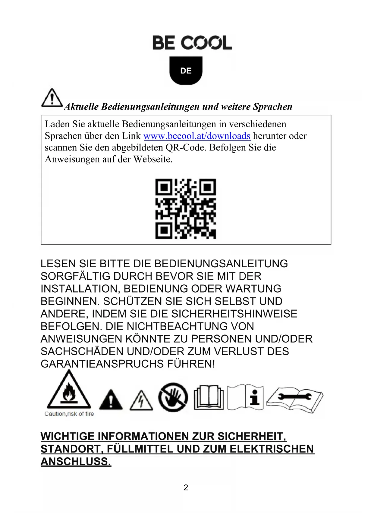 Laden Sie aktuelle Bedienungsanleitungen in verschiedenen Sprachen über den Link www.becool.at/downloads herunter oder scannen Sie den abgebildeten QR-Code. Befolgen Sie die Anweisungen auf der Webseite.