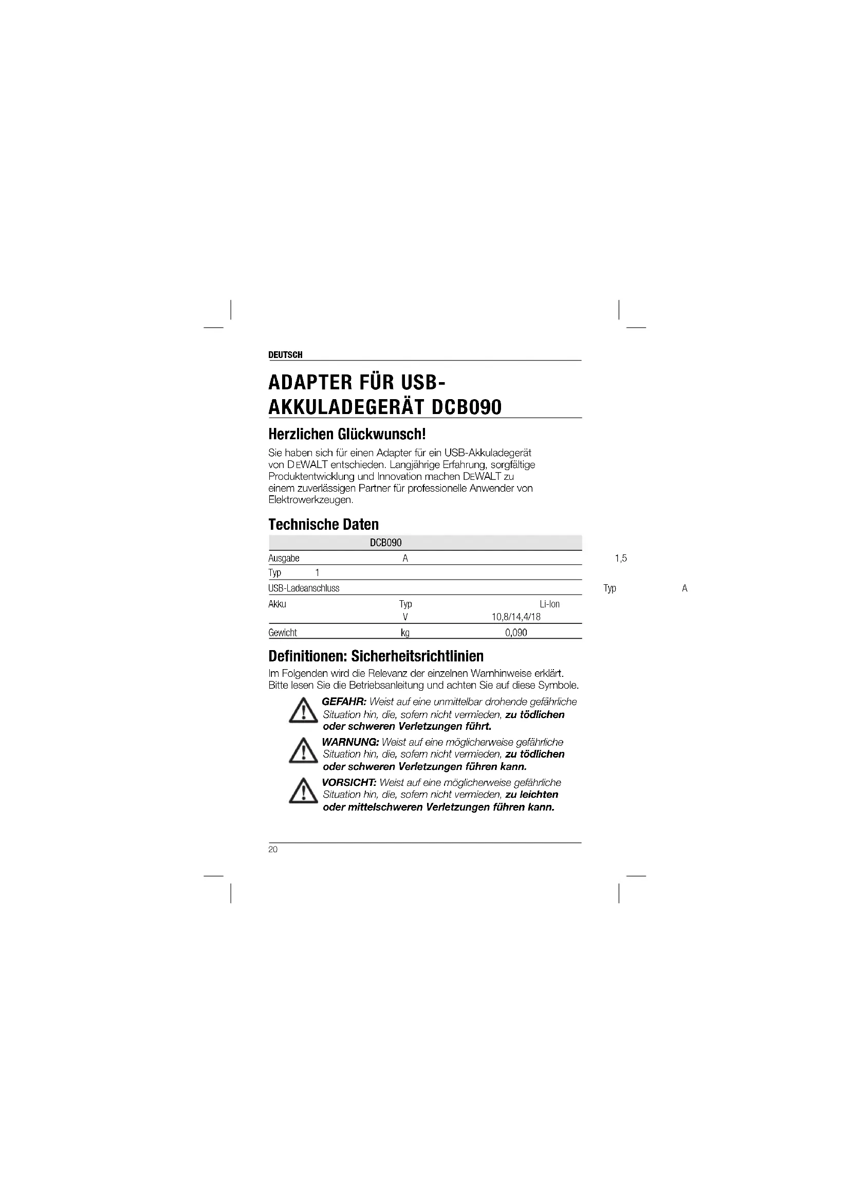 Herzlichen Glückwunsch! Sie haben sich für einen Adapter für ein USB-Akkuladegerät von D EWALT entschieden. Langjährige Erfahrung, sorgfältige Produktentwicklung und Innovation machen DEWALT zu einem zuverlässigen Partner für professionelle Anwender von Elektrowerkzeugen. Technische Daten DCB090 Ausgabe A 1,5 Typ 1 USB-Ladeanschluss Typ A Akku Typ Li-Ion V 10,8/14,4/18 Gewicht kg 0,090 Defi nitionen: Sicherheitsrichtlinien Im Folgenden wird die Relevanz der einzelnen Warnhinweise erklärt. Bitte lesen Sie die Betriebsanleitung und achten Sie auf diese Symbole. GEFAHR: Weist auf eine unmittelbar drohende gefährliche Situation hin, die, sofern nicht vermieden, zu tödlichen oder schweren Verletzungen führt. WARNUNG: Weist auf eine möglicherweise gefährliche Situation hin, die, sofern nicht vermieden, zu tödlichen oder schweren Verletzungen führen kann. VORSICHT: Weist auf eine möglicherweise gefährliche Situation hin, die, sofern nicht vermieden, zu leichten oder mittelschweren Verletzungen führen kann.DEUTSCH