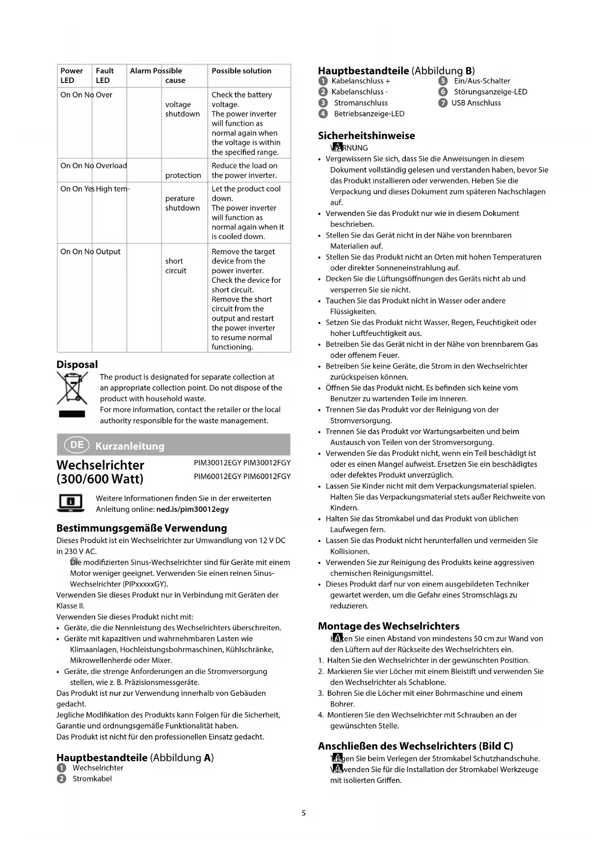 Kurzanleitung Wechselrichter (300/600 Watt) PIM30012EGY PIM30012FGY PIM60012EGY PIM60012FGYWeitere Informationen nden Sie in der erweiterten Anleitung online: ned.is/pim30012egy Bestimmungsgemäße Verwendung Dieses Produkt ist ein Wechselrichter zur Umwandlung von 12 V DC in 230 V AC. Die modizierten Sinus-Wechselrichter sind für Geräte mit einem Motor weniger geeignet. Verwenden Sie einen reinen Sinus-Wechselrichter (PIPxxxxxGY).Verwenden Sie dieses Produkt nur in Verbindung mit Geräten der Klasse II.Verwenden Sie dieses Produkt nicht mit:• Geräte, die die Nennleistung des Wechselrichters überschreiten.• Geräte mit kapazitiven und wahrnehmbaren Lasten wie Klimaanlagen, Hochleistungsbohrmaschinen, Kühlschränke, Mikrowellenherde oder Mixer.• Geräte, die strenge Anforderungen an die Stromversorgung stellen, wie z. B. Präzisionsmessgeräte.Das Produkt ist nur zur Verwendung innerhalb von Gebäuden gedacht.Jegliche Modikation des Produkts kann Folgen für die Sicherheit, Garantie und ordnungsgemäße Funktionalität haben.Das Produkt ist nicht für den professionellen Einsatz gedacht. Hauptbestandteile (Abbildung A) 1 Wechselrichter2 Stromkabel Hauptbestandteile (Abbildung B) 1 Kabelanschluss +2 Kabelanschluss -3 Stromanschluss4 Betriebsanzeige-LED5 Ein/Aus-Schalter6 Störungsanzeige-LED7 USB Anschluss Sicherheitshinweise