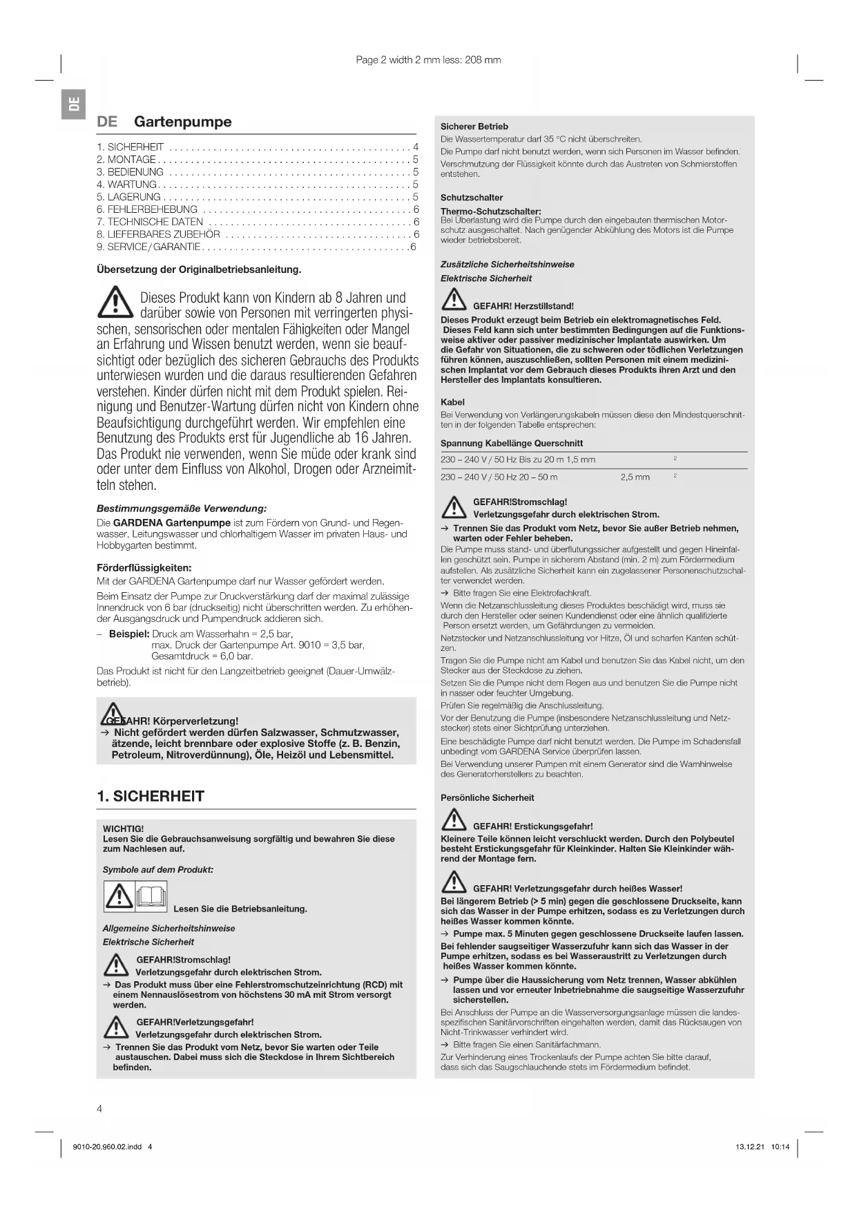 Übersetzung der Originalbetriebsanleitung. Dieses Produkt kann von Kindern ab 8 Jahren und darüber sowie von Personen mit verringerten physi- schen, sensorischen oder mentalen Fähigkeiten oder Mangel an Erfahrung und Wissen benutzt werden, wenn sie beauf- sichtigt oder bezüglich des sicheren Gebrauchs des Produkts unterwiesen wurden und die daraus resultierenden Gefahren verstehen. Kinder dürfen nicht mit dem Produkt spielen. Rei- nigung und Benutzer-Wartung dürfen nicht von Kindern ohne Beaufsichtigung durchgeführt werden. Wir empfehlen eine Benutzung des Produkts erst für Jugendliche ab 16 Jahren. Das Produkt nie verwenden, wenn Sie müde oder krank sind oder unter dem Einfluss von Alkohol, Drogen oder Arzneimit- teln stehen. Bestimmungsgemäße Verwendung: Die GARDENA Gartenpumpe ist zum Fördern von Grund- und Regen- wasser, Leitungswasser und chlorhaltigem Wasser im privaten Haus- und Hobbygarten bestimmt. Förderflüssigkeiten: Mit der GARDENA Gartenpumpe darf nur Wasser gefördert werden. Beim Einsatz der Pumpe zur Druckverstärkung darf der maximal zulässige Innendruck von 6 bar (druckseitig) nicht überschritten werden. Zu erhöhen- der Ausgangsdruck und Pumpendruck addieren sich. – Beispiel: Druck am Wasserhahn = 2,5 bar, max. Druck der Gartenpumpe Art. 9010 = 3,5 bar, Gesamtdruck = 6,0 bar. Das Produkt ist nicht für den Langzeitbetrieb geeignet (Dauer-Umwälz- betrieb). GEFAHR! Körperverletzung! v Nicht gefördert werden dürfen Salzwasser, Schmutzwasser, ätzende, leicht brennbare oder explosive Stoffe (z. B. Benzin, Petroleum, Nitroverdünnung), Öle, Heizöl und Lebensmittel. Sicherer Betrieb Die Wassertemperatur darf 35 °C nicht überschreiten. Die Pumpe darf nicht benutzt werden, wenn sich Personen im Wasser befinden. Verschmutzung der Flüssigkeit könnte durch das Austreten von Schmierstoffen entstehen. Schutzschalter Thermo-Schutzschalter: Bei Überlastung wird die Pumpe durch den eingebauten thermischen Motor- schutz ausgeschaltet. Nach genügender Abkühlung des Motors ist die Pumpe wieder betriebsbereit. Zusätzliche Sicherheitshinweise Elektrische Sicherheit GEFAHR! Herzstillstand! Dieses Produkt erzeugt beim Betrieb ein elektromagnetisches Feld. Dieses Feld kann sich unter bestimmten Bedingungen auf die Funktions- weise aktiver oder passiver medizinischer Implantate auswirken. Um die Gefahr von Situationen, die zu schweren oder tödlichen Verletzungen führen können, auszuschließen, sollten Personen mit einem medizini- schen Implantat vor dem Gebrauch dieses Produkts ihren Arzt und den Hersteller des Implantats konsultieren. Kabel Bei Verwendung von Verlängerungskabeln müssen diese den Mindestquerschnit- ten in der folgenden Tabelle entsprechen: Spannung Kabellänge Querschnitt 230 – 240 V / 50 Hz Bis zu 20 m 1,5 mm