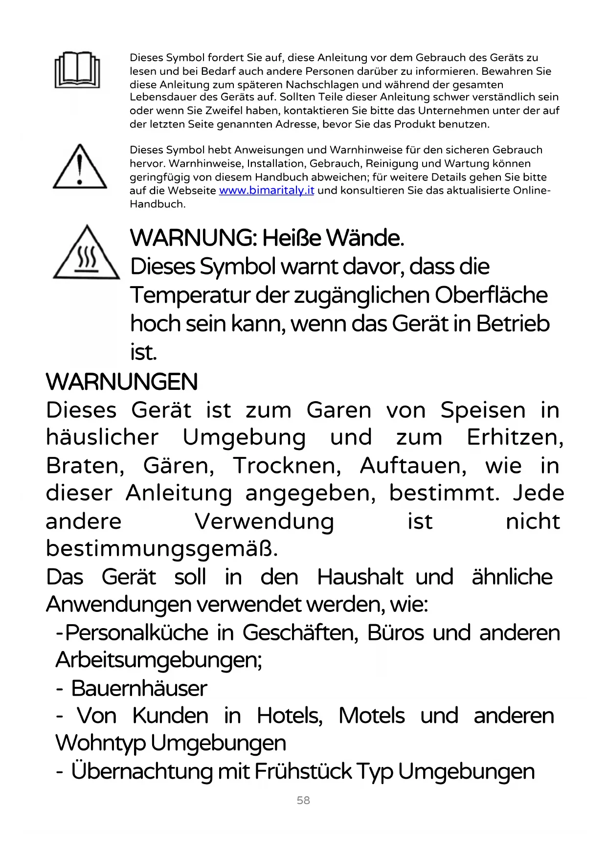 Dieses Symbol hebt Anweisungen und Warnhinweise für den sicheren Gebrauch hervor. Warnhinweise, Installation, Gebrauch, Reinigung und Wartung können geringfügig von diesem Handbuch abweichen; für weitere Details gehen Sie bitte auf die Webseite www.bimaritaly.it und konsultieren Sie das aktualisierte Online- Handbuch.