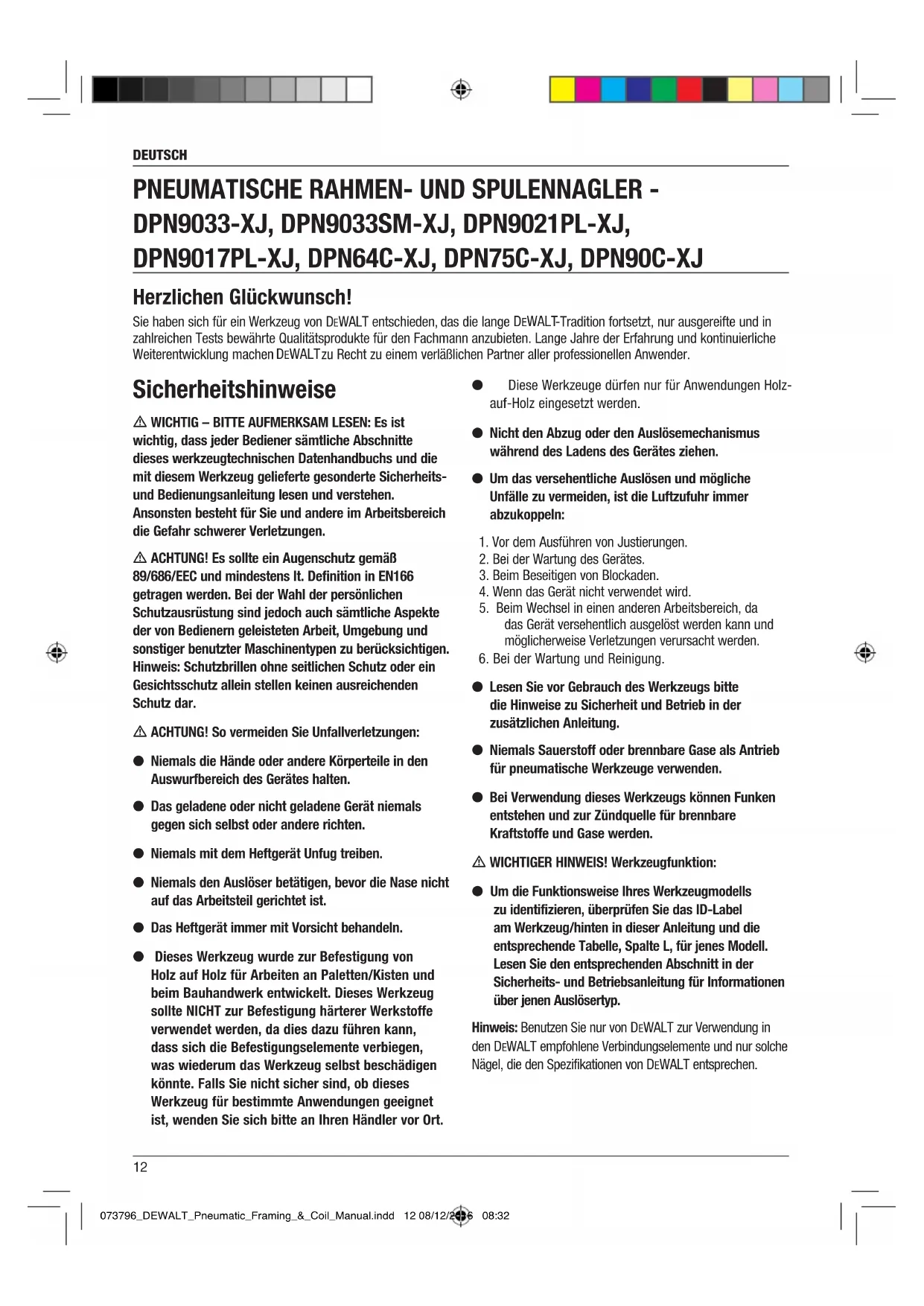 DPN9033-XJ, DPN9033SM-XJ, DPN9021PL-XJ, DPN9017PL-XJ, DPN64C-XJ, DPN75C-XJ, DPN90C-XJ Herzlichen Glückwunsch! Sie haben sich für ein Werkzeug von DEWALT entschieden, das die lange DeWALT -Tradition fortsetzt, nur ausgereifte und in zahlreichen Tests bewährte Qualitätsprodukte für den Fachmann anzubieten. Lange Jahre der Erfahrung und kontinuierliche Weiterentwicklung machen DeWALT zu Recht zu einem verläßlichen Partner aller professionellen Anwender. 073796_DEWALT_Pneumatic_Framing_&_Coil_Manual.indd 12 08/12/2016 08:32DEUTSCH