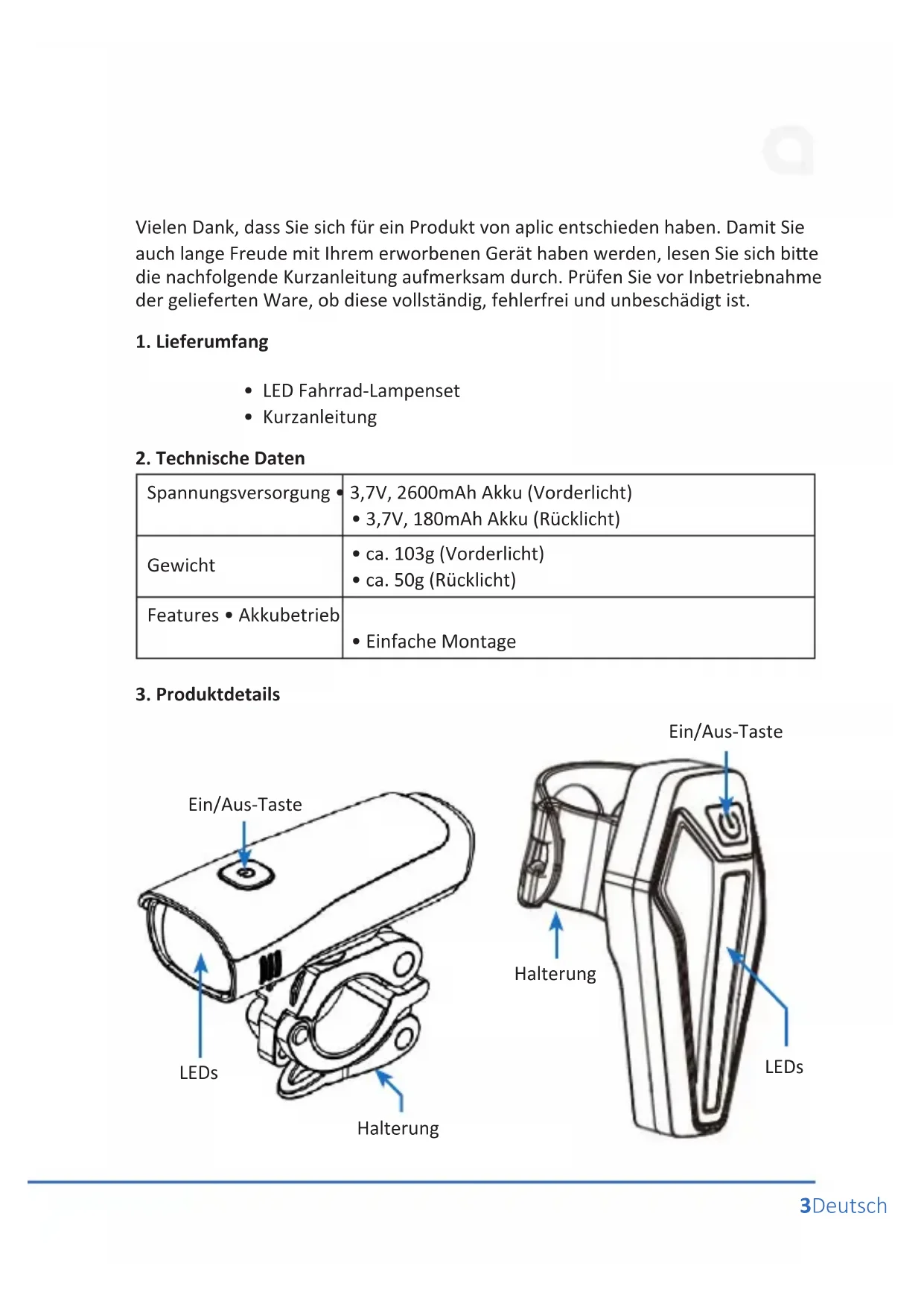 Um das LED Fahrrad-Lampenset in Betrieb zu nehmen, laden Sie zunächst die Ak- kus der Front- und der Rückleuchte auf. Önen Sie dafür die Schutzklappen der Ladeports und laden Sie die Geräte mit einem USB-Kabel über eine 5V DC Strom- quelle wie z.B. das Ladegerät eines Smartphones auf. Wenn die Baerieanzeige der Geräte rot leuchtet, müssen diese aufgeladen wer- den. Die Baerieanzeige der Frontleuchte ist im Ein/Aus-Schalter integriert. Und die Baerieanzeige der Rückleuchte bendet sich an der Vorderseite des Gerätes. Um die Lampen einzuschalten und auszuschalten, drücken Sie bie die jeweilige Ein/Aus-Taste.