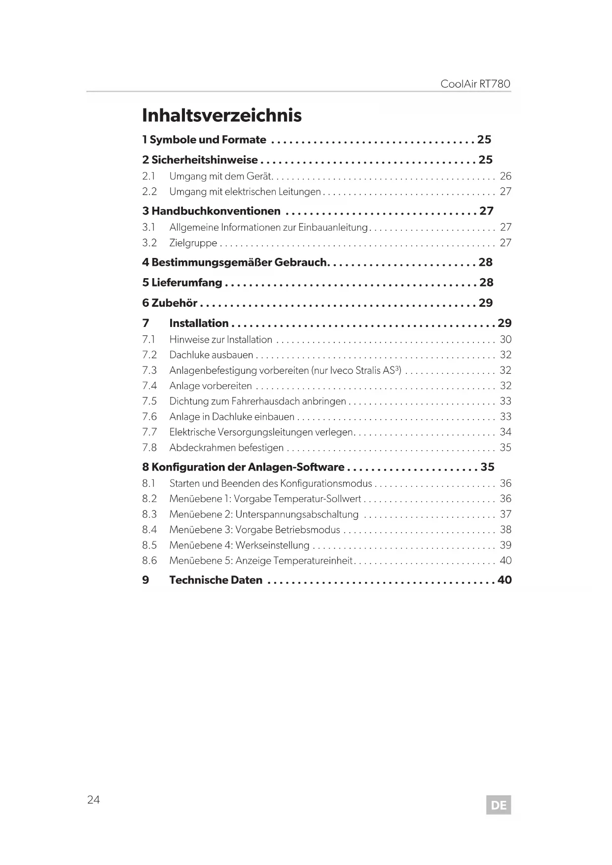 - Bevor Sie das Fahrzeugdach besteigen, prüfen Sie, ob dieses für Personen begehbar ist. Zulässige Dachlasten können Sie beim Fahrzeughersteller erfragen. RT780-Iveco--I-16s.book Seite 29 Donnerstag, 6. Juli 2017 3:16 15DE Installation CoolAir RT780