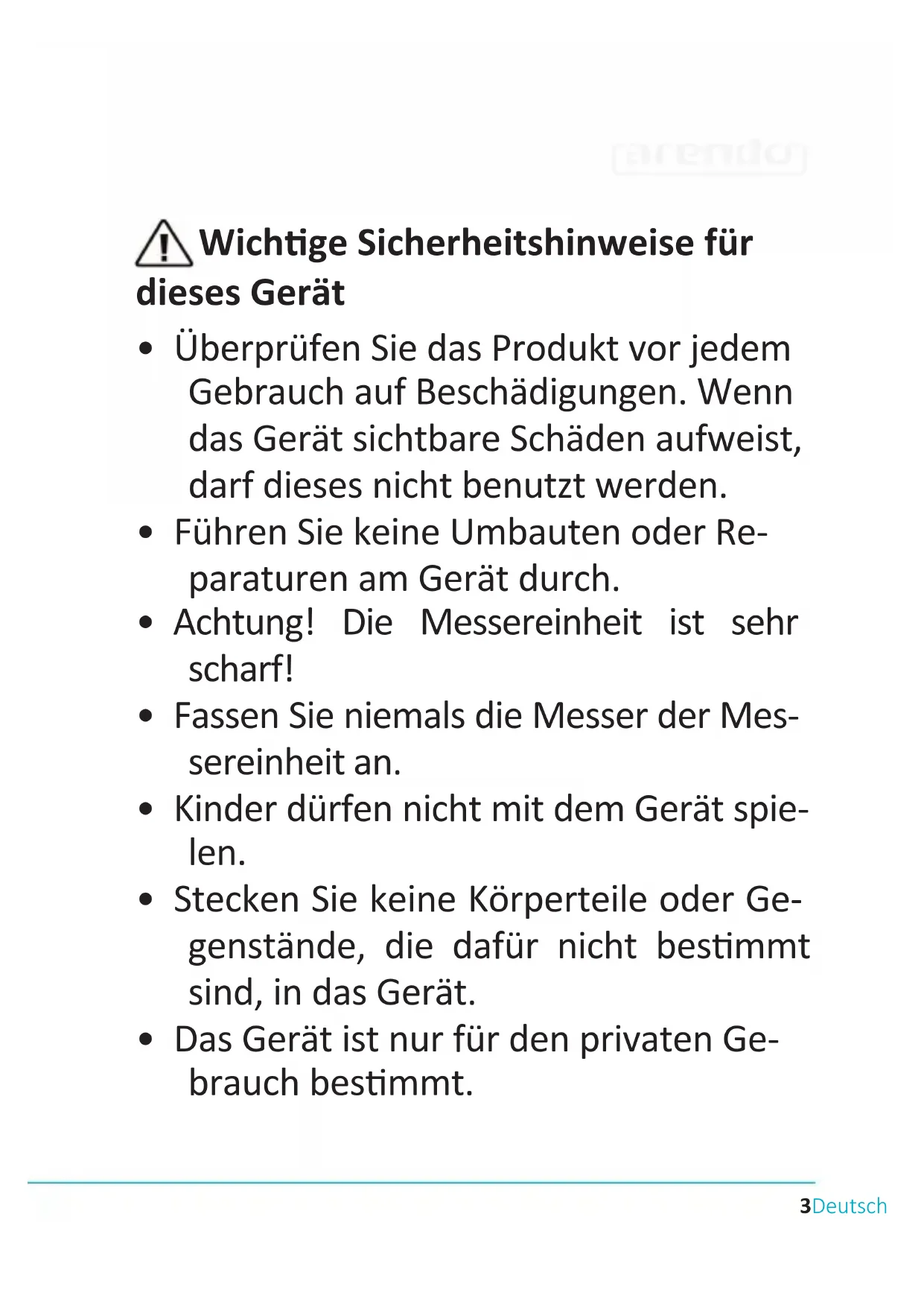 - Die Gewürzmühle ist geeignet für gro- bes Salz und Pfeerkörner.5Deutsch Vielen Dank, dass Sie sich für ein Produkt von Arendo entschieden haben. Damit Sie auch lange Freude mit Ihrem erworbenen Gerät haben werden, lesen Sie sich bie die nachfolgende Kurzanleitung aufmerksam durch. Prüfen Sie vor Inbetrieb- nahme der gelieferten Ware, ob diese vollständig, fehlerfrei und unbeschädigt ist.