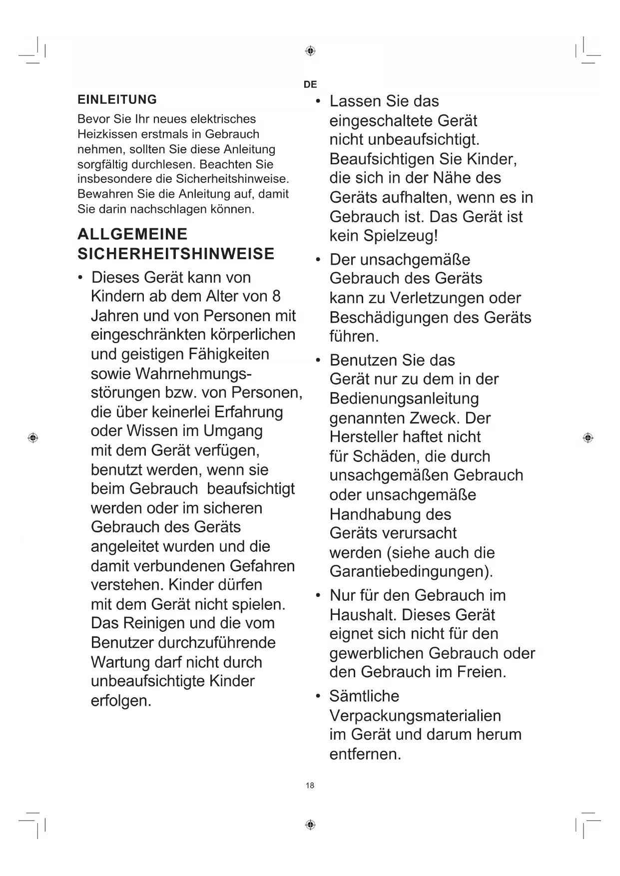 EINLEITUNG Bevor Sie Ihr neues elektrisches Heizkissen erstmals in Gebrauch nehmen, sollten Sie diese Anleitung sorgfältig durchlesen. Beachten Sie insbesondere die Sicherheitshinweise. Bewahren Sie die Anleitung auf, damit Sie darin nachschlagen können. ALLGEMEINE SICHERHEITSHINWEISE