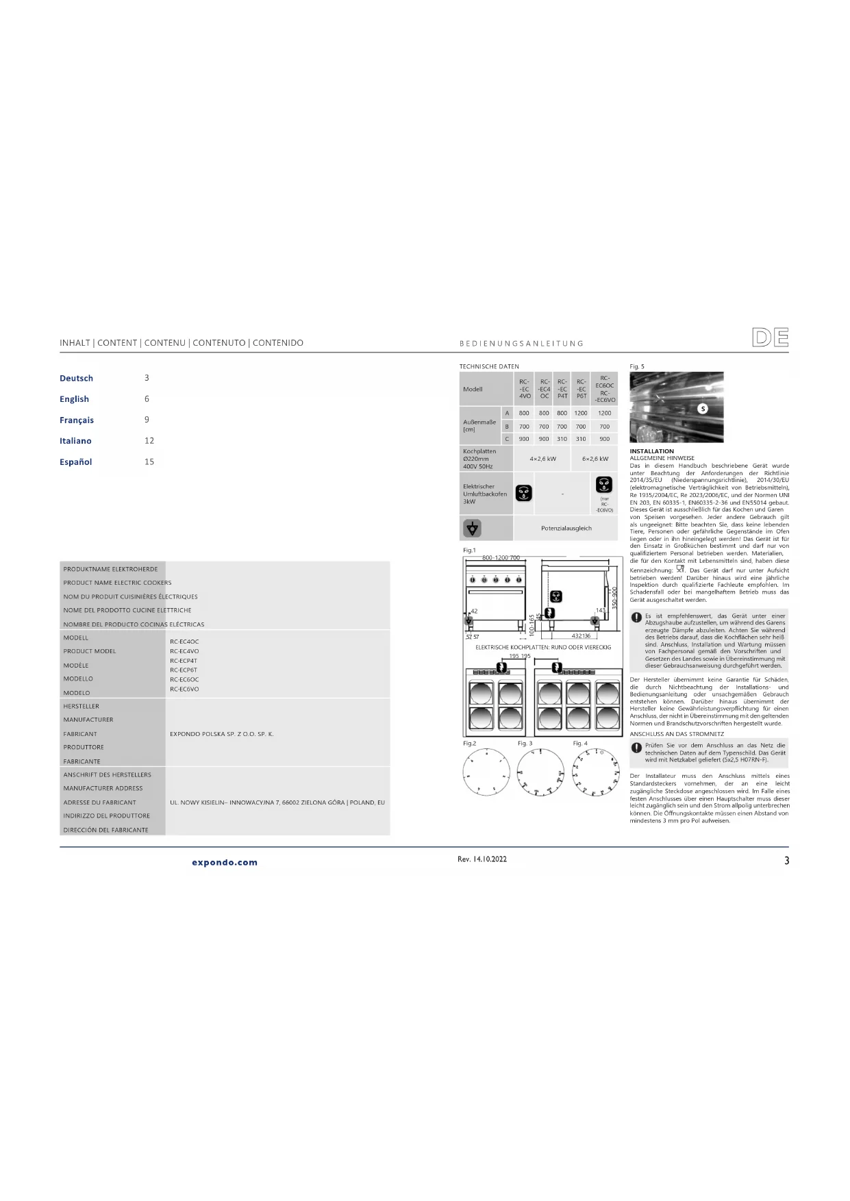 (nur RC- -EC6VO) PotenzialausgleichFig.1Fig.2 Fig. 3 Fig. 4Fig. 5 Der Hersteller übernimmt keine Garantie für Schäden, die durch Nichtbeachtung der Installations- und Bedienungsanleitung oder unsachgemäßen Gebrauch entstehen können. Darüber hinaus übernimmt der Hersteller keine Gewährleistungsverpichtung für einen Anschluss, der nicht in Übereinstimmung mit den geltenden Normen und Brandschutzvorschriften hergestellt wurde.ANSCHLUSS AN DAS STROMNETZPrüfen Sie vor dem Anschluss an das Netz die technischen Daten auf dem Typenschild. Das Gerät wird mit Netzkabel geliefert (5x2,5 H07RN-F).Der Installateur muss den Anschluss mittels eines Standardsteckers vornehmen, der an eine leicht zugängliche Steckdose angeschlossen wird. Im Falle eines festen Anschlusses über einen Hauptschalter muss dieser leicht zugänglich sein und den Strom allpolig unterbrechen können. Die Önungskontakte müssen einen Abstand von mindestens 3 mm pro Pol aufweisen.
