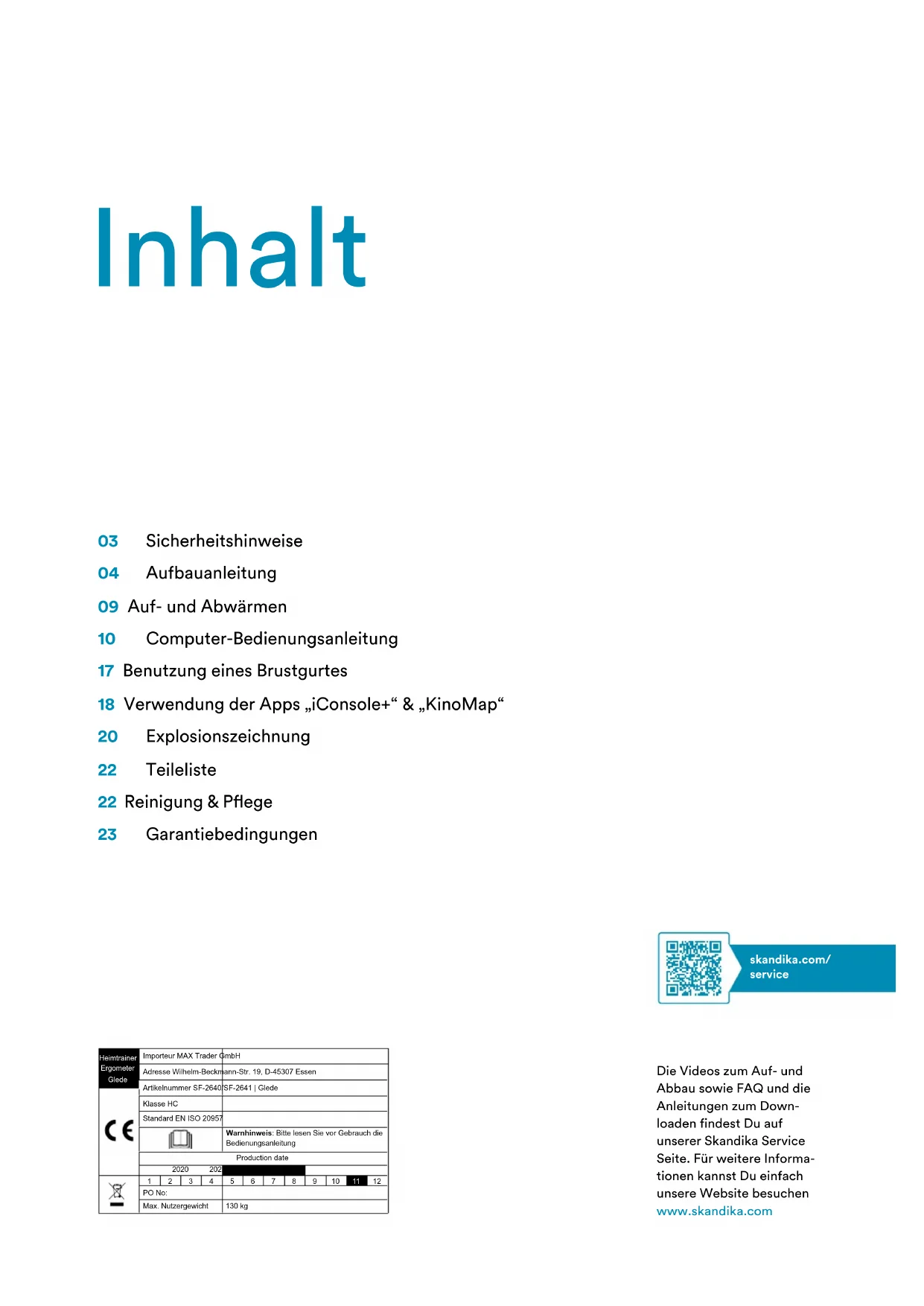 Dieses Produkt darf am Ende seiner Lebensdauer nicht über den normalen Haushaltsabfall entsorgt werden, sondern muss an einem Sammelpunkt für das Recycling von elektrischen und elektronischen Geräten abgegeben werden. Das Symbol auf dem Produkt, der Gebrauchsanleitung oder der Verpackung weist darauf hin. Die Werkstoe sind gemäß ihrer Kennzeichnung wieder verwertbar. Mit der Wiederver- wendung, der stoichen Verwertung oder anderen Formen der Verwertung von Altgeräten leisten Sie einen wichtigen Beitrag zum Schutze unserer Umwelt. Bitte erfragen Sie bei der Gemeindeverwaltung die zuständige Entsorgungsstelle.24 Contents Please visit the Skandika Service portal on our website for setup & help videos, FAQs and downloa- dable instructions. For more information about Skandika, simply visit our main page www.skandika.com skandika.com/ service 25 Safety precautions 26 Assembly instructions 31 Warm-up and cool-down 32 Computer operation manual 39 Using a chest-belt 40 Using the apps „iConsole+“ & „KinoMap“ 42 Exploded diagram 44 Parts list 44 Cleaning and care 45 Guarantee Conditions Importeur MAX Trader GmbHAdresse Wilhelm-Beckmann-Str. 19, D-45307 EssenArtikelnummer SF-2640/SF-2641 | GledeKlasse HCStandard EN ISO 20957Warnhinweis: Bitte lesen Sie vor Gebrauch die BedienungsanleitungProduction date2020 2021 2022 PO No:Max. Nutzergewicht 130 kgHeimtrainerErgometerGlede25