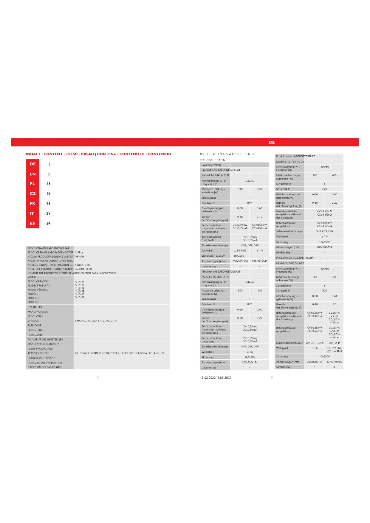 Schutzklasse I Schutzart IP IP20 Gleichspannungsre- gelbereich [V] 0-30 0-60 Bereich der Stromregelung [A] 0-50 0-10 Betriebsstabilisie- rungsfaktor während der Belastung CV≤0,3%mV CC≤0,3%mA CV≤0,5%mV CC≤0,5%mA Betriebsstabilisie- rungsfaktor CV≤0,2%mV CC≤0,5%mA Sicherheitseinrichtungen OVP, OTP, OPP Welligkeit ≤ 1% RMS ≤ 1% Sicherung 15A250V 10A250V Abmessungen [mm] 260x365x160 197x322x145 Gewicht [kg] 7 4 Produktname LABORNETZGERÄT Modell S-LS-78 S-LS-79 Nennspannung [V~]/ Frequenz [Hz] 230/50 Maximale Leistungs- aufnahme [W]