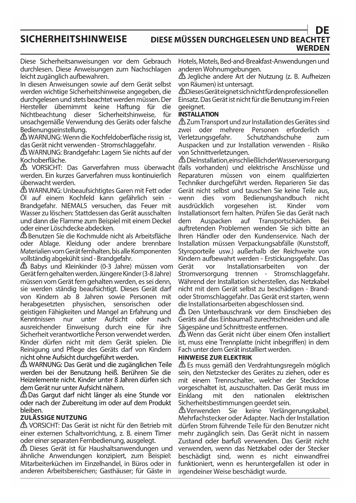 5EE64350Diese Sicherheitsanweisungen vor dem Gebrauch durchlesen. Diese Anweisungen zum Nachschlagen leicht zugänglich aufbewahren. In diesen Anweisungen sowie auf dem Gerät selbst werden wichtige Sicherheitshinweise angegeben, die durchgelesen und stets beachtet werden müssen. Der Hersteller übernimmt keine Haftung für die Nichtbeachtung dieser Sicherheitshinweise, für unsachgemäße Verwendung des Geräts oder falsche Bedienungseinstellung. WARNUNG: Wenn die Kochfeldoberäche rissig ist, das Gerät nicht verwenden - Stromschlaggefahr. WARNUNG: Brandgefahr: Lagern Sie nichts auf der Kochoberäche. VORSICHT: Das Garverfahren muss überwacht werden. Ein kurzes Garverfahren muss kontinuierlich überwacht werden. WARNUNG: Unbeaufsichtigtes Garen mit Fett oder Öl auf einem Kochfeld kann gefährlich sein - Brandgefahr. NIEMALS versuchen, das Feuer mit Wasser zu löschen: Stattdessen das Gerät ausschalten und dann die Flamme zum Beispiel mit einem Deckel oder einer Löschdecke abdecken. Benutzen Sie die Kochmulde nicht als Arbeitsäche oder Ablage. Kleidung oder andere brennbare Materialien vom Gerät fernhalten, bis alle Komponenten vollständig abgekühlt sind - Brandgefahr. Babys und Kleinkinder (0-3 Jahre) müssen vom Gerät fern gehalten werden. Jüngere Kinder (3-8 Jahre) müssen vom Gerät fern gehalten werden, es sei denn, sie werden ständig beaufsichtigt. Dieses Gerät darf von Kindern ab 8 Jahren sowie Personen mit herabgesetzten physischen, sensorischen oder geistigen Fähigkeiten und Mangel an Erfahrung und Kenntnissen nur unter Aufsicht oder nach ausreichender Einweisung durch eine für ihre Sicherheit verantwortliche Person verwendet werden. Kinder dürfen nicht mit dem Gerät spielen. Die Reinigung und Pege des Geräts darf von Kindern nicht ohne Aufsicht durchgeführt werden. WARNUNG: Das Gerät und die zugänglichen Teile werden bei der Benutzung heiß. Berühren Sie die Heizelemente nicht. Kinder unter 8 Jahren dürfen sich dem Gerät nur unter Aufsicht nähern. Das Gargut darf nicht länger als eine Stunde vor oder nach der Zubereitung im oder auf dem Produkt bleiben.