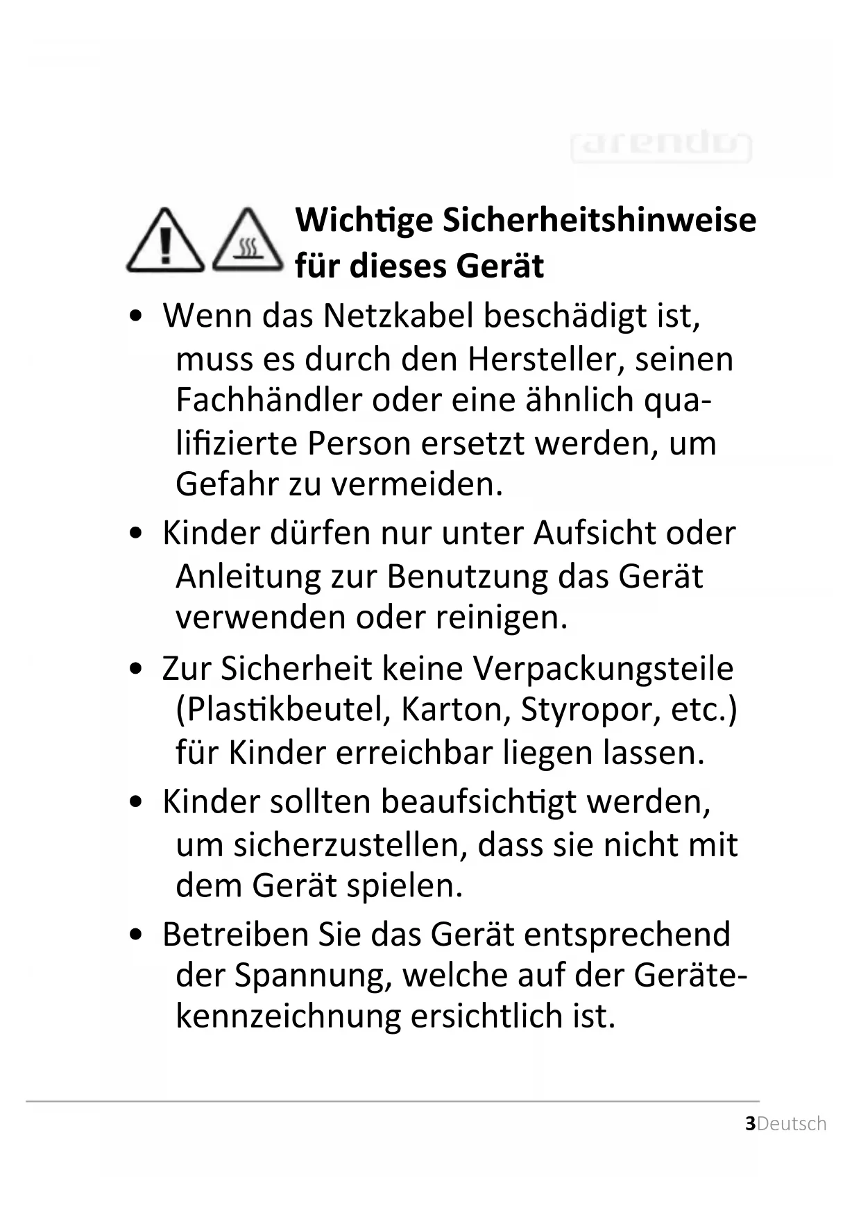 - Decken Sie den Luauslass am Gerät nicht ab.8 Deutsch Vielen Dank, dass Sie sich für ein Produkt von Arendo entschieden haben. Damit Sie auch Freude mit dem erworbenen Gerät haben, lesen Sie sich bie die nach- folgende Bedienungsanleitung aufmerksam durch. Prüfen Sie vor Inbetriebnahme der gelieferten Ware, ob diese vollständig, fehlerfrei und unbeschädigt ist.
