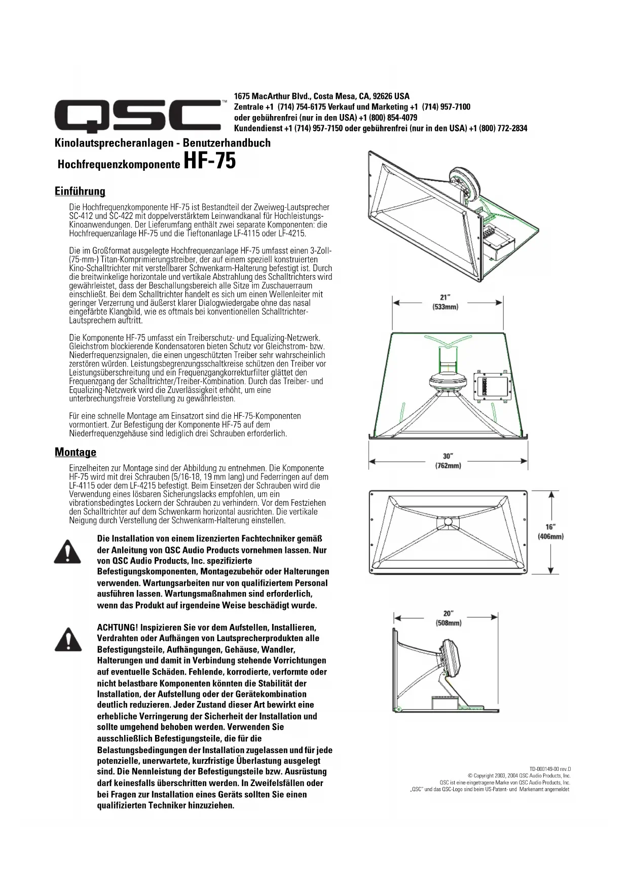 ) ausgestattet. Hochfrequenz-Eingangsklemmen (HF INPUT) Das Verstärker-Ausgangssignal an die Lautsprechereingangsklemmen HF INPUT anschließen. Darauf achten, dass die richtige Polarität gewahrt ist: Das Plus-Signal (+) des Verstärkers muss an das Plus-Signal (+ HF INPUT) des Lautsprechers und das Minus-Signal (-) des Verstärkers muss an das Minus-Signal des Lautsprechers (- HF INPUT) angeschlossen werden. Stets den größtmöglichen Leiterquerschnitt und die kürzeste Leiterlänge verwenden. HINWEIS! Zur Optimierung der Leistung muss die richtige Polarität der Lautsprecheranschlüsse in der gesamten Anlage gewahrt sein. An der Komponente HF-75 kein Vollbereichssignal anlegen! Die Komponente HF-75 enthält keine Frequenzweiche, sondern lediglich ein Kompensations-/Verzögerungsnetzwerk. Sämtliche erforderliche Signalverarbeitung muss der HF-75 vorgelagert sein. Hochfrequenz-Ausgangsklemmen (HF OUTPUT) Die Hochfrequenz-Ausgangsklemmen (HF OUTPUT) wurden werkseitig mit dem Komprimierungstreiber verbunden. Sie sollten AUSSCHLIESSLICH mit dem Komprimierungstreiber der HF-75 verbunden sein. QSC DCM oder sonstige aktive Frequenzweiche Komprimierungstreiber HF-75 Verstärker Verarbeitetes Hochfrequenz- Programmsignal Verbindungs- klemmen HF-75 Hinweis: Das Anschlussgehäuse HF-75 enthält kein Crossover-Netzwerk! Es ist darauf zu achten, dass an die Hochfrequenz-Eingangsklemmen (HF INPUT) nur ein Hochfrequenzsignal angelegt wird, um eine Beschädigung des Komprimierungstreibers zu vermeiden.HF-75 - Technische Daten (können jederzeit ohne vorherige Mitteilung geändert werden) Frequenzbereich: 600 Hz - 16 kHz (-6 dB, Vollraum) Nominelle Abstrahlung: 90° horizontal x +15 bis -35° vertikal (50° insgesamt, vertikale Einstellung erfolgt durch verstellbare Schwenkarm- Halterung). Die horizontale Abstrahlung kann durch Änderung der Montageposition auf dem Gehäuse LF-4215 vor dem Festziehen der Schrauben eingestellt werden. DI: 9,0 dB (durchschnittl. 600 bis 16.000 Hz) Q: 8,0 (durchschnittl. 600 bis 16.000 Hz) Maximaler Ausgang: 133 dB berechneter Spitzen-SPL, 1 m, Halbraum Impedanz: 8 Ohm (nominell) 8,0 Ohm min. bei 3.000 Hz 104 Ohm max. bei 475 Hz Maximale Eingangsleistung: 60 W eff. (100 Stunden bei Rosa-Rauschen mit einem Crestfaktor von 6 dB, 500 bis 20.000 Hz, IEC-Methode) 80 W eff. (2 Stunden Rosa-Rauschen mit einem Crestfaktor von 6 dB, 60 - 6.000 Hz, AES-Methode) Empfindlichkeit: 108 dB Halbraum, 1 W, 1 m Crossover-Frequenz: 700 Hz oder höher, 24 dB je Oktave Anschlüsse: Barrier-Strip-Schraubklemmen für Litzendraht-Querschnitt bis zu 10 AWG (5,2 mm