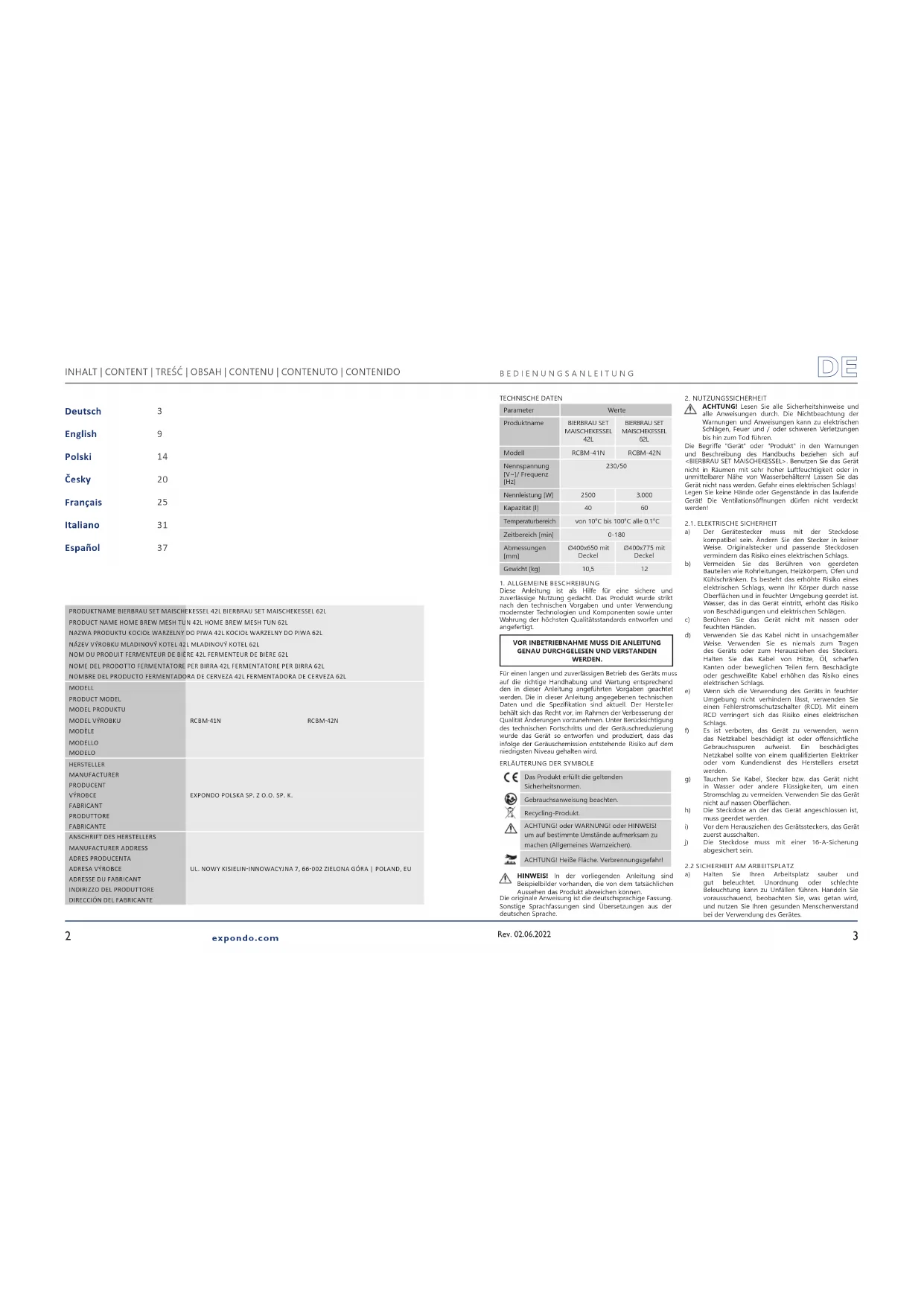 BEDIENUNGSANLEITUNG TECHNISCHE DATEN Parameter WerteProduktname BIERBRAU SETMAISCHEKESSEL 42L BIERBRAU SETMAISCHEKESSEL 62L Modell RCBM-41N RCBM-42NNennspannung [V~]/ Frequenz [Hz] 230/50Nennleistung [W] 2500 3.000Kapazität [l] 40 60Temperaturbereich von 10°C bis 100°C alle 0,1°CZeitbereich [min] 0-180Abmessungen [mm] Ø400x650 mit DeckelØ400x775 mit DeckelGewicht [kg] 10,5 12ERLÄUTERUNG DER SYMBOLE1. ALLGEMEINE BESCHREIBUNG Diese Anleitung ist als Hilfe für eine sichere und zuverlässige Nutzung gedacht. Das Produkt wurde strikt nach den technischen Vorgaben und unter Verwendung modernster Technologien und Komponenten sowie unter Wahrung der höchsten Qualitätsstandards entworfen und angefertigt.Das Produkt erfüllt die geltenden Sicherheitsnormen.Gebrauchsanweisung beachten.Recycling-Produkt.ACHTUNG! oder WARNUNG! oder HINWEIS! um auf bestimmte Umstände aufmerksam zu machen (Allgemeines Warnzeichen).ACHTUNG! Heiße Fläche. Verbrennungsgefahr!VOR INBETRIEBNAHME MUSS DIE ANLEITUNG GENAU DURCHGELESEN UND VERSTANDEN WERDEN.Für einen langen und zuverlässigen Betrieb des Geräts muss auf die richtige Handhabung und Wartung entsprechend den in dieser Anleitung angeführten Vorgaben geachtet werden. Die in dieser Anleitung angegebenen technischen Daten und die Spezikation sind aktuell. Der Hersteller behält sich das Recht vor, im Rahmen der Verbesserung der Qualität Änderungen vorzunehmen. Unter Berücksichtigung des technischen Fortschritts und der Geräuschreduzierung wurde das Gerät so entworfen und produziert, dass das infolge der Geräuschemission entstehende Risiko auf dem niedrigsten Niveau gehalten wird. HINWEIS! In der vorliegenden Anleitung sind Beispielbilder vorhanden, die von dem tatsächlichen Aussehen das Produkt abweichen können.Die originale Anweisung ist die deutschsprachige Fassung. Sonstige Sprachfassungen sind Übersetzungen aus der deutschen Sprache.2. NUTZUNGSSICHERHEIT ACHTUNG! Lesen Sie alle Sicherheitshinweise und alle Anweisungen durch. Die Nichtbeachtung der Warnungen und Anweisungen kann zu elektrischen Schlägen, Feuer und / oder schweren Verletzungen bis hin zum Tod führen. Die Begrie "Gerät" oder "Produkt" in den Warnungen und Beschreibung des Handbuchs beziehen sich auf <BIERBRAU SET MAISCHEKESSEL>. Benutzen Sie das Gerät nicht in Räumen mit sehr hoher Luftfeuchtigkeit oder in unmittelbarer Nähe von Wasserbehältern! Lassen Sie das Gerät nicht nass werden. Gefahr eines elektrischen Schlags! Legen Sie keine Hände oder Gegenstände in das laufende Gerät! Die Ventilationsönungen dürfen nicht verdeckt werden!2.1. ELEKTRISCHE SICHERHEIT a) Der Gerätestecker muss mit der Steckdose kompatibel sein. Ändern Sie den Stecker in keiner Weise. Originalstecker und passende Steckdosen vermindern das Risiko eines elektrischen Schlags. b) Vermeiden Sie das Berühren von geerdeten Bauteilen wie Rohrleitungen, Heizkörpern, Öfen und Kühlschränken. Es besteht das erhöhte Risiko eines elektrischen Schlags, wenn Ihr Körper durch nasse Oberächen und in feuchter Umgebung geerdet ist. Wasser, das in das Gerät eintritt, erhöht das Risiko von Beschädigungen und elektrischen Schlägen. c) Berühren Sie das Gerät nicht mit nassen oder feuchten Händen. d) Verwenden Sie das Kabel nicht in unsachgemäßer Weise. Verwenden Sie es niemals zum Tragen des Geräts oder zum Herausziehen des Steckers. Halten Sie das Kabel von Hitze, Öl, scharfen Kanten oder beweglichen Teilen fern. Beschädigte oder geschweißte Kabel erhöhen das Risiko eines elektrischen Schlags. e) Wenn sich die Verwendung des Geräts in feuchter Umgebung nicht verhindern lässt, verwenden Sie einen Fehlerstromschutzschalter (RCD). Mit einem RCD verringert sich das Risiko eines elektrischen Schlags. f) Es ist verboten, das Gerät zu verwenden, wenn das Netzkabel beschädigt ist oder oensichtliche Gebrauchsspuren aufweist. Ein beschädigtes Netzkabel sollte von einem qualizierten Elektriker oder vom Kundendienst des Herstellers ersetzt werden. g) Tauchen Sie Kabel, Stecker bzw. das Gerät nicht in Wasser oder andere Flüssigkeiten, um einen Stromschlag zu vermeiden. Verwenden Sie das Gerät nicht auf nassen Oberächen. h) Die Steckdose an der das Gerät angeschlossen ist, muss geerdet werden. i) Vor dem Herausziehen des Gerätssteckers, das Gerät zuerst ausschalten. j) Die Steckdose muss mit einer 16-A-Sicherung abgesichert sein.2.2 SICHERHEIT AM ARBEITSPLATZ a) Halten Sie Ihren Arbeitsplatz sauber und gut beleuchtet. Unordnung oder schlechte Beleuchtung kann zu Unfällen führen. Handeln Sie vorausschauend, beobachten Sie, was getan wird, und nutzen Sie Ihren gesunden Menschenverstand bei der Verwendung des Gerätes.