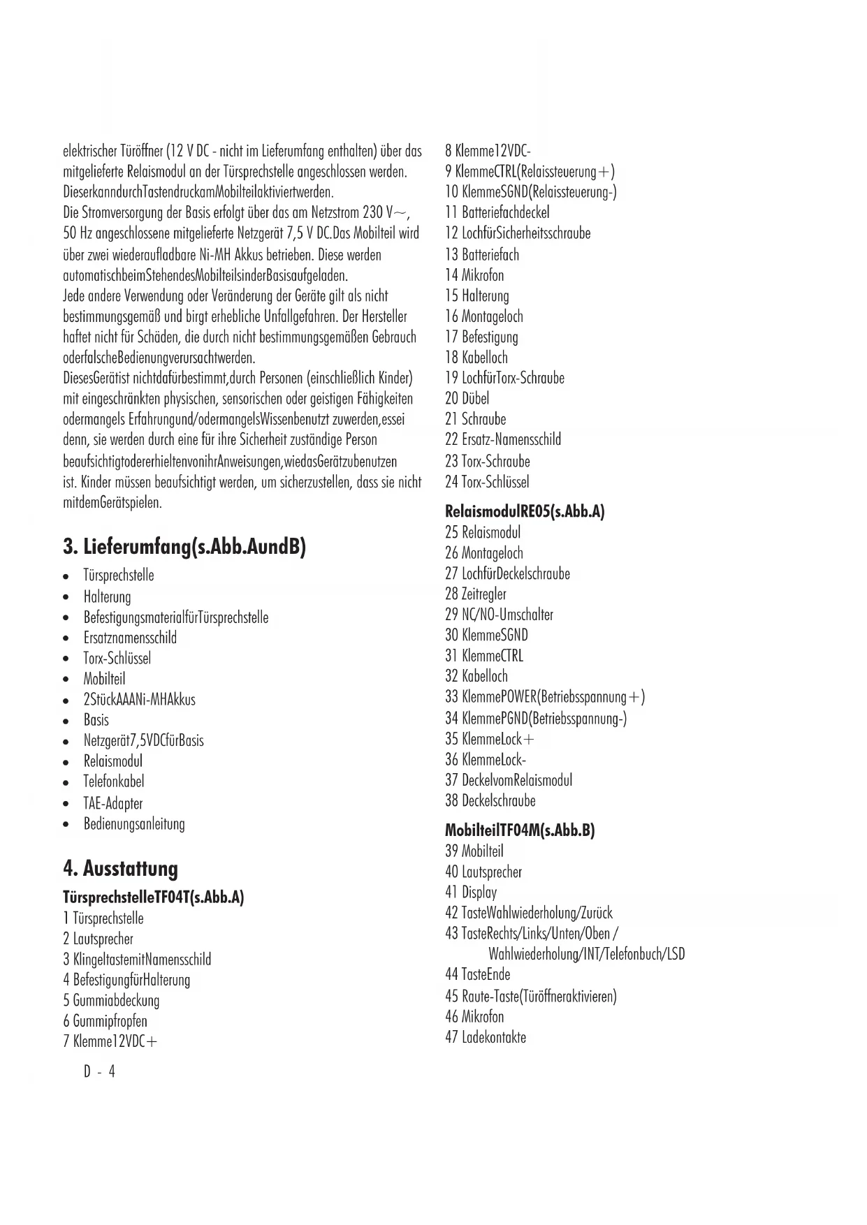 64D-4 elektrischer Türöffner (12 V DC - nicht im Lieferumfang enthalten) über das mitgelieferte Relaismodul an der Türsprechstelle angeschlossen werden. DieserkanndurchTastendruckamMobilteilaktiviertwerden. Die Stromversorgung der Basis erfolgt über das am Netzstrom 230 V~, 50 Hz angeschlossene mitgelieferte Netzgerät 7,5 V DC.Das Mobilteil wird über zwei wiederaufladbare Ni-MH Akkus betrieben. Diese werden automatischbeimStehendesMobilteilsinderBasisaufgeladen. Jede andere Verwendung oder Veränderung der Geräte gilt als nicht bestimmungsgemäß und birgt erhebliche Unfallgefahren. Der Hersteller haftet nicht für Schäden, die durch nicht bestimmungsgemäßen Gebrauch oderfalscheBedienungverursachtwerden. DiesesGerätist nichtdafürbestimmt,durch Personen (einschließlich Kinder) mit eingeschränkten physischen, sensorischen oder geistigen Fähigkeiten odermangels Erfahrungund/odermangelsWissenbenutzt zuwerden,essei denn, sie werden durch eine für ihre Sicherheit zuständige Person beaufsichtigtodererhieltenvonihrAnweisungen,wiedasGerätzubenutzen ist. Kinder müssen beaufsichtigt werden, um sicherzustellen, dass sie nicht mitdemGerätspielen. Türsprechstelle Halterung BefestigungsmaterialfürTürsprechstelle Ersatznamensschild Torx-Schlüssel Mobilteil 2StückAAANi-MHAkkus Basis Netzgerät7,5VDCfürBasis Relaismodul Telefonkabel TAE-Adapter Bedienungsanleitung 1 Türsprechstelle 2 Lautsprecher 3 KlingeltastemitNamensschild 4 BefestigungfürHalterung 5 Gummiabdeckung 6 Gummipfropfen 7 Klemme12VDC+ TürsprechstelleTF04T(s.Abb.A)