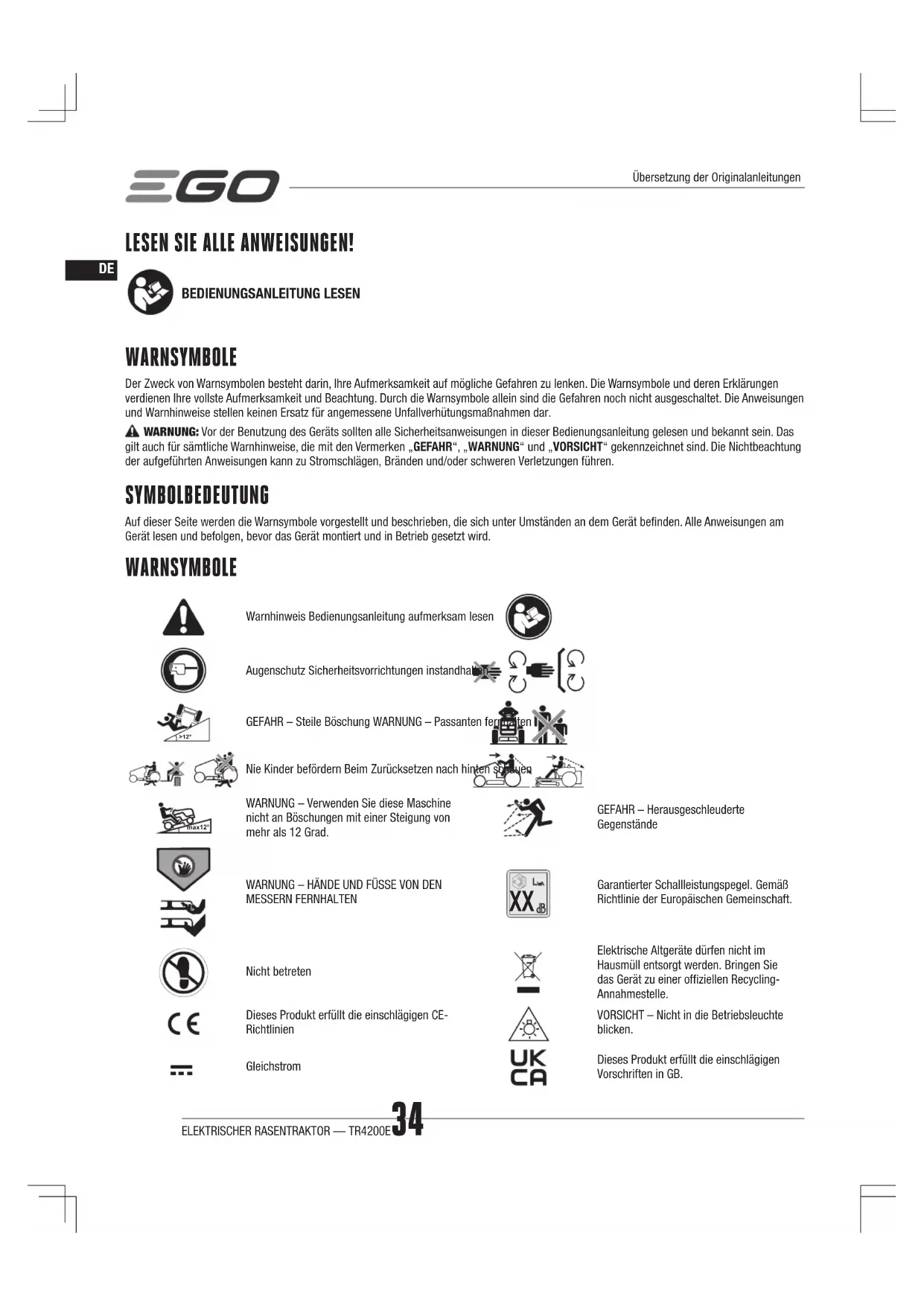 LESEN SIE ALLE ANWEISUNGEN! BEDIENUNGSANLEITUNG LESEN WARNSYMBOLE Der Zweck von Warnsymbolen besteht darin, Ihre Aufmerksamkeit auf mögliche Gefahren zu lenken. Die Warnsymbole und deren Erklärungen verdienen Ihre vollste Aufmerksamkeit und Beachtung. Durch die Warnsymbole allein sind die Gefahren noch nicht ausgeschaltet. Die Anweisungen und Warnhinweise stellen keinen Ersatz für angemessene Unfallverhütungsmaßnahmen dar. WARNUNG: Vor der Benutzung des Geräts sollten alle Sicherheitsanweisungen in dieser Bedienungsanleitung gelesen und bekannt sein. Das gilt auch für sämtliche Warnhinweise, die mit den Vermerken „GEFAHR“, „WARNUNG“ und „VORSICHT“ gekennzeichnet sind. Die Nichtbeachtung der aufgeführten Anweisungen kann zu Stromschlägen, Bränden und/oder schweren Verletzungen führen. SYMBOLBEDEUTUNG Auf dieser Seite werden die Warnsymbole vorgestellt und beschrieben, die sich unter Umständen an dem Gerät benden. Alle Anweisungen am Gerät lesen und befolgen, bevor das Gerät montiert und in Betrieb gesetzt wird. WARNSYMBOLE Warnhinweis Bedienungsanleitung aufmerksam lesenAugenschutz Sicherheitsvorrichtungen instandhalten>12°GEFAHR – Steile Böschung WARNUNG – Passanten fernhaltenNie Kinder befördern Beim Zurücksetzen nach hinten schauenmax12°WARNUNG – Verwenden Sie diese Maschine nicht an Böschungen mit einer Steigung von mehr als 12 Grad.GEFAHR – Herausgeschleuderte GegenständeWARNUNG – HÄNDE UND FÜSSE VON DEN MESSERN FERNHALTEN Garantierter Schallleistungspegel. Gemäß Richtlinie der Europäischen Gemeinschaft.Nicht betretenElektrische Altgeräte dürfen nicht im Hausmüll entsorgt werden. Bringen Sie das Gerät zu einer ofziellen Recycling-Annahmestelle.Dieses Produkt erfüllt die einschlägigen CE-RichtlinienVORSICHT – Nicht in die Betriebsleuchte blicken.GleichstromDieses Produkt erfüllt die einschlägigen Vorschriften in GB.Übersetzung der Originalanleitungen35ELEKTRISCHER RASENTRAKTOR — TR4200E