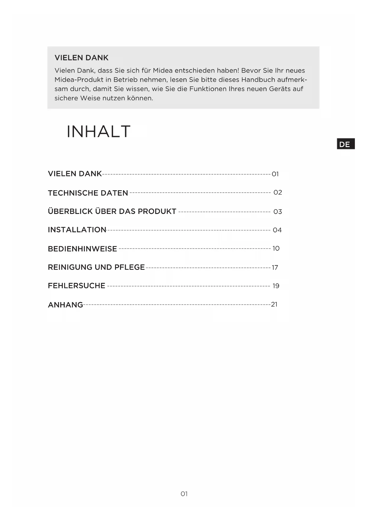 - If the indicator of temperature turns WHITE, this means that the temperature is too high; in this case, increase the refrigerator temperature control setting and wait for 12 hours before performing a new visual inspection of the indicator. When fresh food has been introduced or the door has been left open, it is possible for the indicator of temperature to turn WHITE after a while.01 VIELEN DANK Vielen Dank, dass Sie sich für Midea entschieden haben! Bevor Sie Ihr neues Midea-Produkt in Betrieb nehmen, lesen Sie bitte dieses Handbuch aufmerk- sam durch, damit Sie wissen, wie Sie die Funktionen Ihres neuen Geräts auf sichere Weise nutzen können. INHALT VIELEN DANK