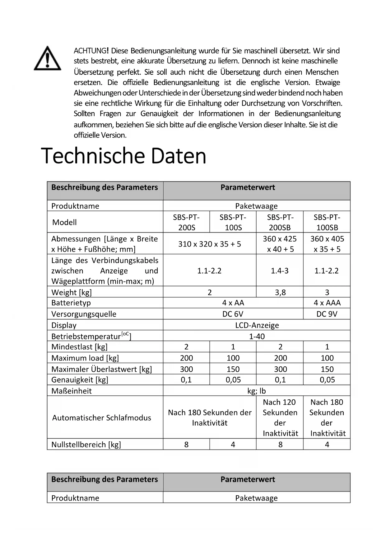 Beschreibung des Parameters Parameterwert Produktname Paketwaage ACHTUNG! Diese Bedienungsanleitung wurde für Sie maschinell übersetzt. Wir sind stets bestrebt, eine akkurate Übersetzung zu liefern. Dennoch ist keine maschinelle Übersetzung perfekt. Sie soll auch nicht die Übersetzung durch einen Menschen ersetzen. Die offizielle Bedienungsanleitung ist die englische Version. Etwaige Abweichungen oder Unterschiede in der Übersetzung sind weder bindend noch haben sie eine rechtliche Wirkung für die Einhaltung oder Durchsetzung von Vorschriften. Sollten Frage n zur Genauigkeit der Informationen in der Bedienungsanleitung aufkommen, beziehen Sie sich bitte auf die englische Version dieser Inhalte. Sie ist die offizielle Version.Modell SBS-PT-200SK SBS-PT-100SK Abmessungen [Länge x Breite x Höhe; mm] 360 x 405 x 65 Abmessung des Displays [mm] 135 x 65 Weight [kg] 3,5 Batterietyp 4 x AA Versorgungsquelle DC 6V Display LCD-Anzeige Betriebstemperatur [oC