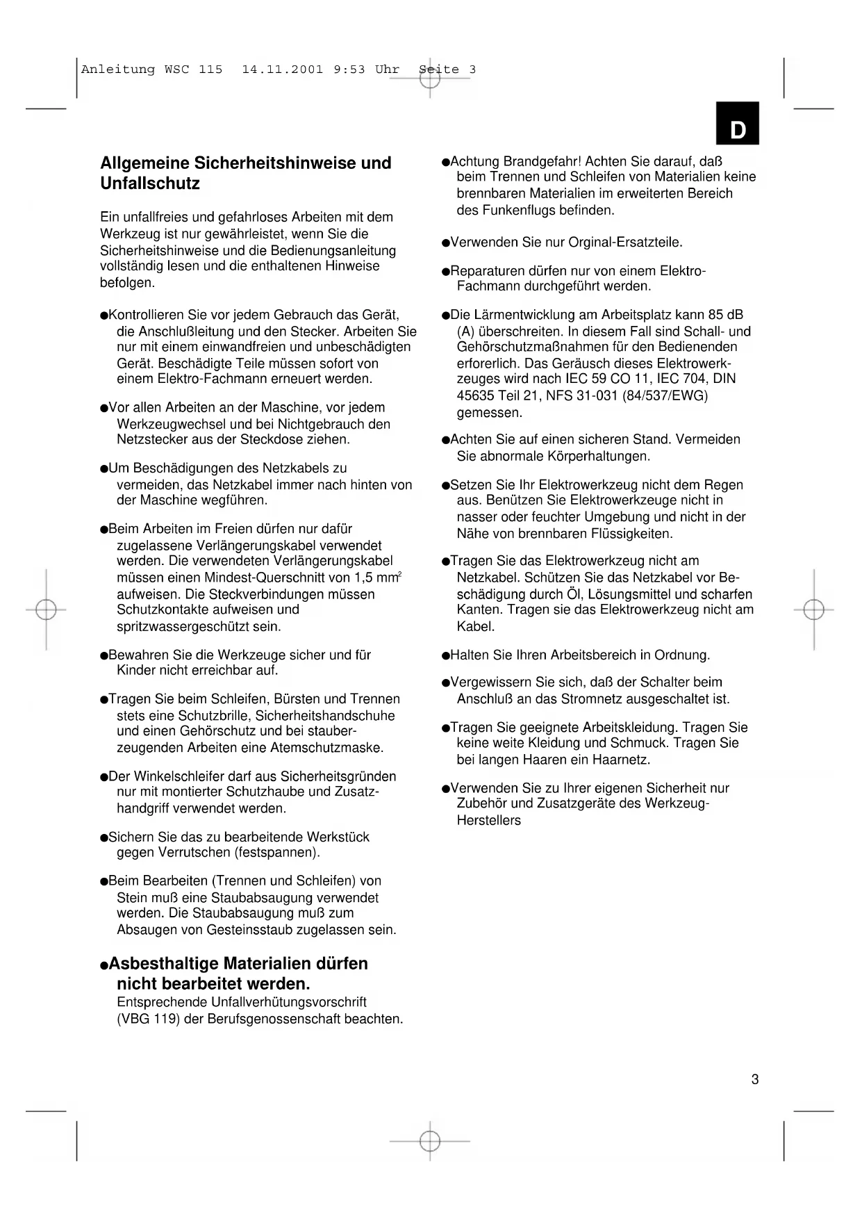 aufweisen. Die Steckverbindungen müssen Schutzkontakte aufweisen und spritzwassergeschützt sein. Bewahren Sie die Werkzeuge sicher und für Kinder nicht erreichbar auf. Tragen Sie beim Schleifen, Bürsten und Trennen stets eine Schutzbrille, Sicherheitshandschuhe und einen Gehörschutz und bei stauber- zeugenden Arbeiten eine Atemschutzmaske. Der Winkelschleifer darf aus Sicherheitsgründen nur mit montierter Schutzhaube und Zusatz- handgriff verwendet werden. Sichern Sie das zu bearbeitende Werkstück gegen Verrutschen (festspannen). Beim Bearbeiten (Trennen und Schleifen) von Stein muß eine Staubabsaugung verwendet werden. Die Staubabsaugung muß zum Absaugen von Gesteinsstaub zugelassen sein. Asbesthaltige Materialien dürfen nicht bearbeitet werden. Entsprechende Unfallverhütungsvorschrift (VBG 119) der Berufsgenossenschaft beachten. Achtung Brandgefahr! Achten Sie darauf, daß beim Trennen und Schleifen von Materialien keine brennbaren Materialien im erweiterten Bereich des Funkenflugs befinden. Verwenden Sie nur Orginal-Ersatzteile. Reparaturen dürfen nur von einem Elektro- Fachmann durchgeführt werden. Die Lärmentwicklung am Arbeitsplatz kann 85 dB (A) überschreiten. In diesem Fall sind Schall- und Gehörschutzmaßnahmen für den Bedienenden erforerlich. Das Geräusch dieses Elektrowerk- zeuges wird nach IEC 59 CO 11, IEC 704, DIN 45635 Teil 21, NFS 31-031 (84/537/EWG) gemessen. Achten Sie auf einen sicheren Stand. Vermeiden Sie abnormale Körperhaltungen. Setzen Sie Ihr Elektrowerkzeug nicht dem Regen aus. Benützen Sie Elektrowerkzeuge nicht in nasser oder feuchter Umgebung und nicht in der Nähe von brennbaren Flüssigkeiten. Tragen Sie das Elektrowerkzeug nicht am Netzkabel. Schützen Sie das Netzkabel vor Be- schädigung durch Öl, Lösungsmittel und scharfen Kanten. Tragen sie das Elektrowerkzeug nicht am Kabel. Halten Sie Ihren Arbeitsbereich in Ordnung. Vergewissern Sie sich, daß der Schalter beim Anschluß an das Stromnetz ausgeschaltet ist. Tragen Sie geeignete Arbeitskleidung. Tragen Sie keine weite Kleidung und Schmuck. Tragen Sie bei langen Haaren ein Haarnetz. Verwenden Sie zu Ihrer eigenen Sicherheit nur Zubehör und Zusatzgeräte des Werkzeug- Herstellers