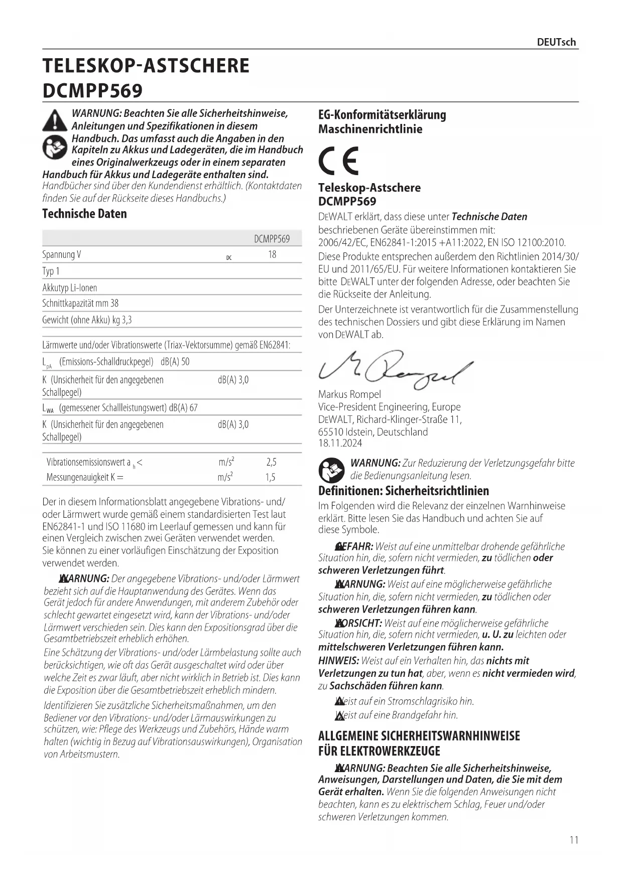 WARNUNG: Beachten Sie alle Sicherheitshinweise, Anweisungen, Darstellungen und Daten, die Sie mit dem Gerät erhalten. Wenn Sie die folgenden Anweisungen nicht beachten, kann es zu elektrischem Schlag, Feuer und/oder schweren Verletzungenkommen. WARNUNG: Zur Reduzierung der Verletzungsgefahr bitte die Bedienungsanleitunglesen. Definitionen: Sicherheitsrichtlinien Im Folgenden wird die Relevanz der einzelnen Warnhinweise erklärt. Bitte lesen Sie das Handbuch und achten Sie auf dieseSymbole. GEFAHR: Weist auf eine unmittelbar drohende gefährliche Situation hin, die, sofern nicht vermieden, zu tödlichen oder schweren Verletzungenführt. WARNUNG: Weist auf eine möglicherweise gefährliche Situation hin, die, sofern nicht vermieden, zu tödlichen oder schweren Verletzungen führenkann. VORSICHT: Weist auf eine möglicherweise gefährliche Situation hin, die, sofern nicht vermieden, u. U. zu leichten oder mittelschweren Verletzungen führenkann. HINWEIS: Weist auf ein Verhalten hin, das nichts mit Verletzungen zu tun hat, aber, wenn es nicht vermieden wird, zu Sachschäden führenkann. Weist auf ein Stromschlagrisikohin. Weist auf eine Brandgefahrhin. EG‑Konformitätserklärung Maschinenrichtlinie Teleskop-Astschere DCMPP569 DeWALT erklärt, dass diese unter Technische Daten beschriebenen Geräte übereinstimmen mit: 2006/42/EC, EN62841-1:2015 +A11:2022, EN ISO 12100:2010.Diese Produkte entsprechen außerdem den Richtlinien 2014/30/EU und 2011/65/EU. Für weitere Informationen kontaktieren Sie bitte DeWALT unter der folgenden Adresse, oder beachten Sie die Rückseite der Anleitung. Der Unterzeichnete ist verantwortlich für die Zusammenstellung des technischen Dossiers und gibt diese Erklärung im Namen von DeWALT ab. Markus Rompel Vice-President Engineering, Europe DeWALT, Richard-Klinger-Straße 11, 65510 Idstein, Deutschland 18.11.2024Der in diesem Informationsblatt angegebene Vibrations- und/oder Lärmwert wurde gemäß einem standardisierten Test laut EN62841-1 und ISO 11680 im Leerlauf gemessen und kann für einen Vergleich zwischen zwei Geräten verwendet werden. Sie können zu einer vorläufigen Einschätzung der Exposition verwendet werden. WARNUNG: Der angegebene Vibrations- und/oder Lärmwert bezieht sich auf die Hauptanwendung des Gerätes. Wenn das Gerät jedoch für andere Anwendungen, mit anderem Zubehör oder schlecht gewartet eingesetzt wird, kann der Vibrations- und/oder Lärmwert verschieden sein. Dies kann den Expositionsgrad über die Gesamtbetriebszeit erheblich erhöhen.Eine Schätzung der Vibrations- und/oder Lärmbelastung sollte auch berücksichtigen, wie oft das Gerät ausgeschaltet wird oder über welche Zeit es zwar läuft, aber nicht wirklich in Betrieb ist. Dies kann die Exposition über die Gesamtbetriebszeit erheblich mindern.Identifizieren Sie zusätzliche Sicherheitsmaßnahmen, um den Bediener vor den Vibrations- und/oder Lärmauswirkungen zu schützen, wie: Pflege des Werkzeugs und Zubehörs, Hände warm halten (wichtig in Bezug auf Vibrationsauswirkungen), Organisation von Arbeitsmustern.DCMPP569Spannung V