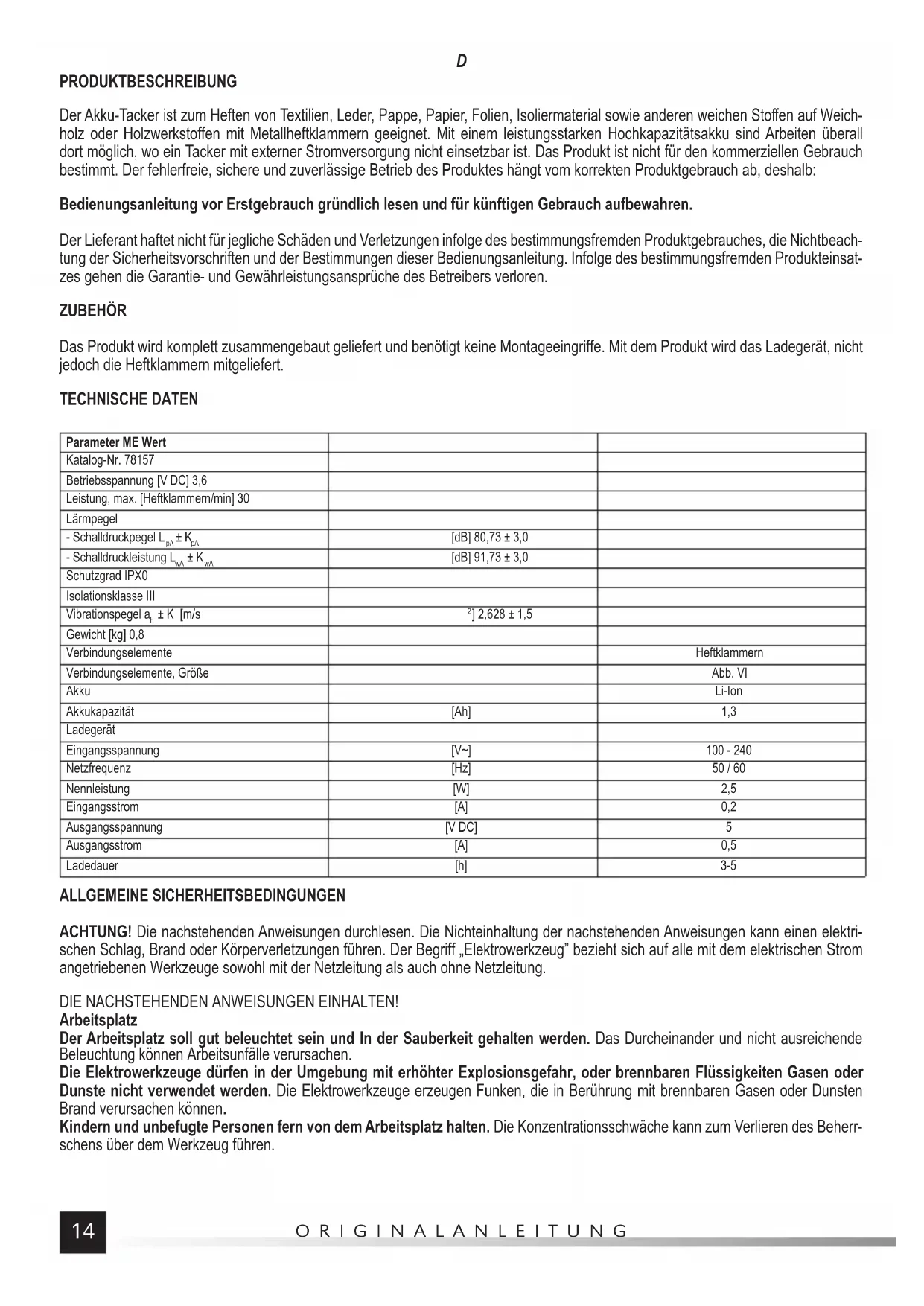 ] 2,628 ± 1,5 Gewicht [kg] 0,8 Verbindungselemente Heftklammern Verbindungselemente, Größe Abb. VI Akku Li-Ion Akkukapazität [Ah] 1,3 Ladegerät Eingangsspannung [V~] 100 - 240 Netzfrequenz [Hz] 50 / 60 Nennleistung [W] 2,5 Eingangsstrom [A] 0,2 Ausgangsspannung [V DC] 5 Ausgangsstrom [A] 0,5 Ladedauer [h] 3-5 ALLGEMEINE SICHERHEITSBEDINGUNGEN ACHTUNG! Die nachstehenden Anweisungen durchlesen. Die Nichteinhaltung der nachstehenden Anweisungen kann einen elektri- schen Schlag, Brand oder Körperverletzungen führen. Der Begriff „Elektrowerkzeug” bezieht sich auf alle mit dem elektrischen Strom angetriebenen Werkzeuge sowohl mit der Netzleitung als auch ohne Netzleitung. DIE NACHSTEHENDEN ANWEISUNGEN EINHALTEN! Arbeitsplatz Der Arbeitsplatz soll gut beleuchtet sein und In der Sauberkeit gehalten werden. Das Durcheinander und nicht ausreichende Beleuchtung können Arbeitsunfälle verursachen. Die Elektrowerkzeuge dürfen in der Umgebung mit erhöhter Explosionsgefahr, oder brennbaren Flüssigkeiten Gasen oder Dunste nicht verwendet werden. Die Elektrowerkzeuge erzeugen Funken, die in Berührung mit brennbaren Gasen oder Dunsten Brand verursachen können. Kindern und unbefugte Personen fern von dem Arbeitsplatz halten. Die Konzentrationsschwäche kann zum Verlieren des Beherr- schens über dem Werkzeug führen.D ORIGINALANLEITUNG