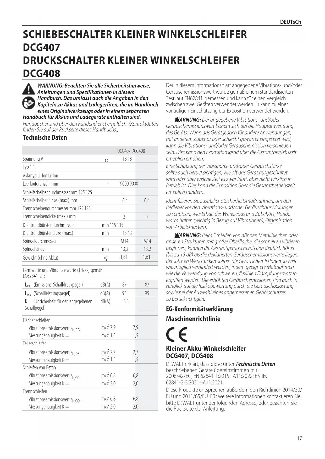 Kleiner Akku‑Winkelschleifer DCG407, DCG408 DeWALT erklärt, dass diese unter Technische Daten beschriebenen Geräte übereinstimmen mit: 2006/42/EG, EN 62841‑1:2015+A11:2022; EN IEC 62841‑2‑3:2021+A11:2021.Diese Produkte entsprechen außerdem den Richtlinien 2014/30/EU und 2011/65/EU. Für weitere Informationen kontaktieren Sie bitte DeWALT unter der folgenden Adresse, oder beachten Sie die Rückseite derAnleitung.Der in diesem Informationsblatt angegebene Vibrations‑ und/oder Geräuschemissionswert wurde gemäß einem standardisierten Test laut EN62841 gemessen und kann für einen Vergleich zwischen zwei Geräten verwendet werden. Er kann zu einer vorläufigen Einschätzung der Exposition verwendetwerden. WARNUNG: Der angegebene Vibrations- und/oder Geräuschemissionswert bezieht sich auf die Hauptanwendung des Geräts. Wenn das Gerät jedoch für andere Anwendungen, mit anderem Zubehör oder schlecht gewartet eingesetzt wird, kann die Vibrations- und/oder Geräuschemission verschieden sein. Dies kann den Expositionsgrad über die Gesamtbetriebszeit erheblicherhöhen.Eine Schätzung der Vibrations- und/oder Geräuschstärke sollte auch berücksichtigen, wie oft das Gerät ausgeschaltet wird oder über welche Zeit es zwar läuft, aber nicht wirklich in Betrieb ist. Dies kann die Exposition über die Gesamtbetriebszeit erheblichmindern.Identifizieren Sie zusätzliche Sicherheitsmaßnahmen, um den Bediener vor den Vibrations- und/oder Geräuschauswirkungen zu schützen, wie: Erhalt des Werkzeugs und Zubehörs, Hände warm halten (wichtig in Bezug auf Vibrationen), Organisation vonArbeitsmustern. WARNUNG: Beim Schleifen von dünnen Metallblechen oder anderen Strukturen mit großer Oberfläche, die schnell zu vibrieren beginnen, können die Gesamtgeräuschemission deutlich höher (bis zu 15dB) als die deklarierten Geräuschemissionswerte liegen. Bei solchen Werkstücken sollten die Geräuschemissionen so weit wie möglich verhindert werden, indem geeignete Maßnahmen wie die Verwendung von schweren, flexiblen Dämpfungsmatten ergriffen werden. Die erhöhten Geräuschemissionen sind auch in Hinblick auf die Risikobewertung durch die Geräuschbelastung sowie bei der Auswahl eines angemessenen Gehörschutzes zuberücksichtigen.DCG407 DCG408Spannung V 18 18Typ 1 1Akkutyp Li‑Ion Li‑IonLeerlaufdrehzahl min 9000 9000Schleifscheibendurchmesser mm 125 125Schleifscheibendicke (max.) mm 6,4 6,4 Trennscheibendurchmesser mm 125 125Trennscheibendicke (max.) mm
