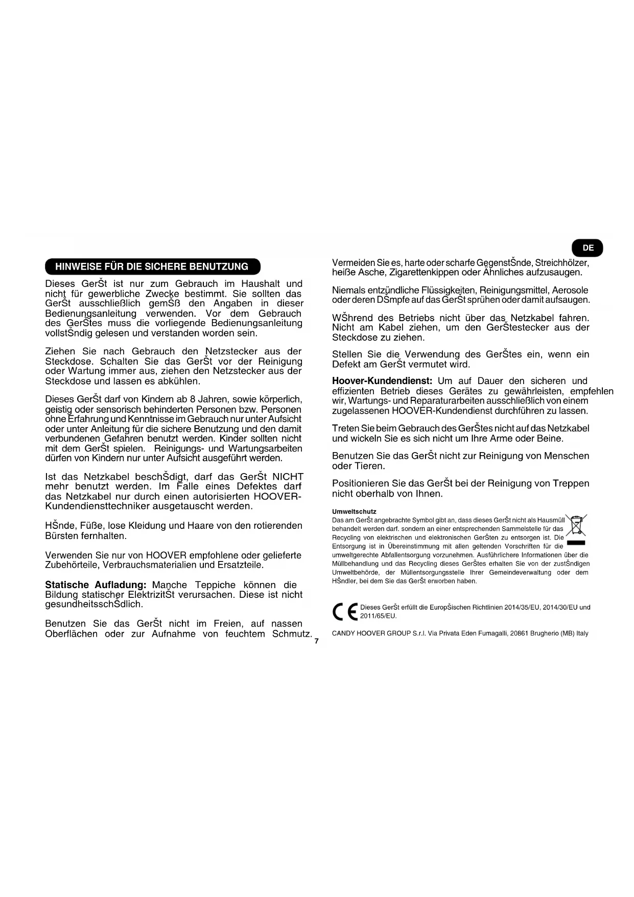Dieses Gerät ist nur zum Gebrauch im Haushalt und nicht für gewerbliche Zwecke bestimmt. Sie sollten das Gerät ausschließlich gemäß den Angaben in dieser Bedienungsanleitung verwenden. Vor dem Gebrauch des Gerätes muss die vorliegende Bedienungsanleitung vollständig gelesen und verstanden worden sein. Ziehen Sie nach Gebrauch den Netzstecker aus der Steckdose. Schalten Sie das Gerät vor der Reinigung oder Wartung immer aus, ziehen den Netzstecker aus der Steckdose und lassen es abkühlen. Dieses Gerät darf von Kindern ab 8 Jahren, sowie körperlich, geistig oder sensorisch behinderten Personen bzw. Personen ohne Erfahrung und Kenntnisse im Gebrauch nur unter Aufsicht oder unter Anleitung für die sichere Benutzung und den damit verbundenen Gefahren benutzt werden. Kinder sollten nicht mit dem Gerät spielen. Reinigungs- und Wartungsarbeiten dürfen von Kindern nur unter Aufsicht ausgeführt werden. Ist das Netzkabel beschädigt, darf das Gerät NICHT mehr benutzt werden. Im Falle eines Defektes darf das Netzkabel nur durch einen autorisierten HOOVER- Kundendiensttechniker ausgetauscht werden. Hände, Füße, lose Kleidung und Haare von den rotierenden Bürsten fernhalten. Verwenden Sie nur von HOOVER empfohlene oder gelieferte Zubehörteile, Verbrauchsmaterialien und Ersatzteile. Statische Auadung: Manche Teppiche können die Bildung statischer Elektrizität verursachen. Diese ist nicht gesundheitsschädlich. Benutzen Sie das Gerät nicht im Freien, auf nassen Oberächen oder zur Aufnahme von feuchtem Schmutz. Vermeiden Sie es, harte oder scharfe Gegenstände, Streichhölzer, heiße Asche, Zigarettenkippen oder Ähnliches aufzusaugen. Niemals entzündliche Flüssigkeiten, Reinigungsmittel, Aerosole oder deren Dämpfe auf das Gerät sprühen oder damit aufsaugen. Während des Betriebs nicht über das Netzkabel fahren. Nicht am Kabel ziehen, um den Gerätestecker aus der Steckdose zu ziehen. Stellen Sie die Verwendung des Gerätes ein, wenn ein Defekt am Gerät vermutet wird. Hoover-Kundendienst: Um auf Dauer den sicheren und efzienten Betrieb dieses Gerätes zu gewährleisten, empfehlen wir, Wartungs- und Reparaturarbeiten ausschließlich von einem zugelassenen HOOVER-Kundendienst durchführen zu lassen. Treten Sie beim Gebrauch des Gerätes nicht auf das Netzkabel und wickeln Sie es sich nicht um Ihre Arme oder Beine. Benutzen Sie das Gerät nicht zur Reinigung von Menschen oder Tieren. Positionieren Sie das Gerät bei der Reinigung von Treppen nicht oberhalb von Ihnen. Umweltschutz Das am Gerät angebrachte Symbol gibt an, dass dieses Gerät nicht als Hausmüll behandelt werden darf. sondern an einer entsprechenden Sammelstelle für das Recycling von elektrischen und elektronischen Geräten zu entsorgen ist. Die Entsorgung ist in Übereinstimmung mit allen geltenden Vorschriften für die umweltgerechte Abfallentsorgung vorzunehmen. Ausführlichere Informationen über die Müllbehandlung und das Recycling dieses Gerätes erhalten Sie von der zuständigen Umweltbehörde, der Müllentsorgungsstelle Ihrer Gemeindeverwaltung oder dem Händler, bei dem Sie das Gerät erworben haben. Dieses Gerät erfüllt die Europäischen Richtlinien 2014/35/EU, 2014/30/EU und 2011/65/EU. CANDY HOOVER GROUP S.r.l. Via Privata Eden Fumagalli, 20861 Brugherio (MB) Italy DE8 GERÄTEBESCHREIBUNG A. Saugschlauch B. Staubbehälterfachabdeckung C. Abdeckung für Abluftlter D. Gerätechassis E. Tragegriff F. Entriegelungslasche für Staubbehälterfachabdeckung G. Mechanische Staubbehälterfüllanzeige H. EIN-/AUS-Schalter
