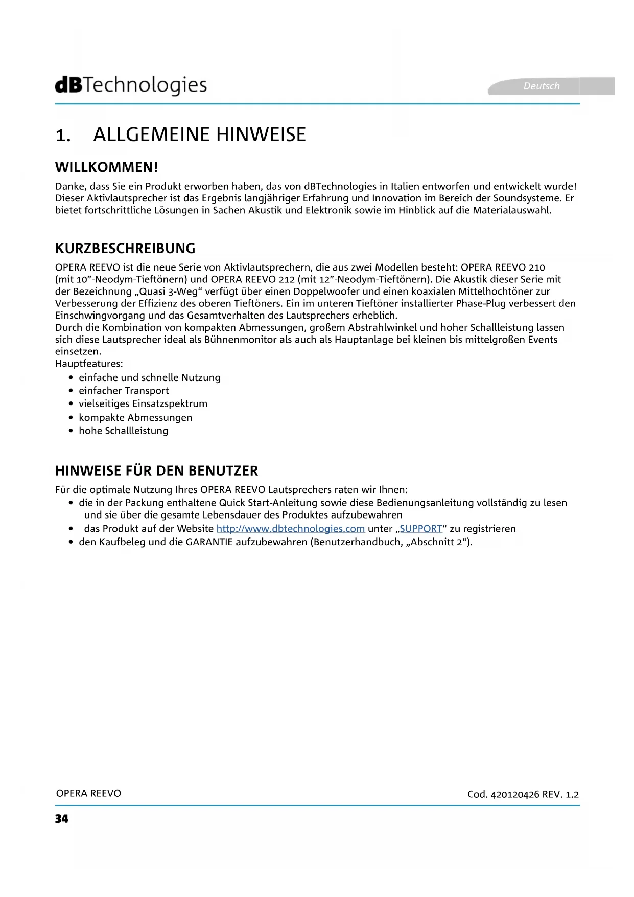 WILLKOMMEN! Danke, dass Sie ein Produkt erworben haben, das von dBTechnologies in Italien entworfen und entwickelt wurde! Dieser Aktivlautsprecher ist das Ergebnis langjähriger Erfahrung und Innovation im Bereich der Soundsysteme. Er bietet fortschrittliche Lösungen in Sachen Akustik und Elektronik sowie im Hinblick auf die Materialauswahl. KURZBESCHREIBUNG OPERA REEVO ist die neue Serie von Aktivlautsprechern, die aus zwei Modellen besteht: OPERA REEVO 210 (mit 10”-Neodym-Tieftönern) und OPERA REEVO 212 (mit 12”-Neodym-Tieftönern). Die Akustik dieser Serie mit der Bezeichnung „Quasi 3-Weg“ verfügt über einen Doppelwoofer und einen koaxialen Mittelhochtöner zur Verbesserung der Effizienz des oberen Tieftöners. Ein im unteren Tieftöner installierter Phase-Plug verbessert den Einschwingvorgang und das Gesamtverhalten des Lautsprechers erheblich. Durch die Kombination von kompakten Abmessungen, großem Abstrahlwinkel und hoher Schallleistung lassen sich diese Lautsprecher ideal als Bühnenmonitor als auch als Hauptanlage bei kleinen bis mittelgroßen Events einsetzen. Hauptfeatures: