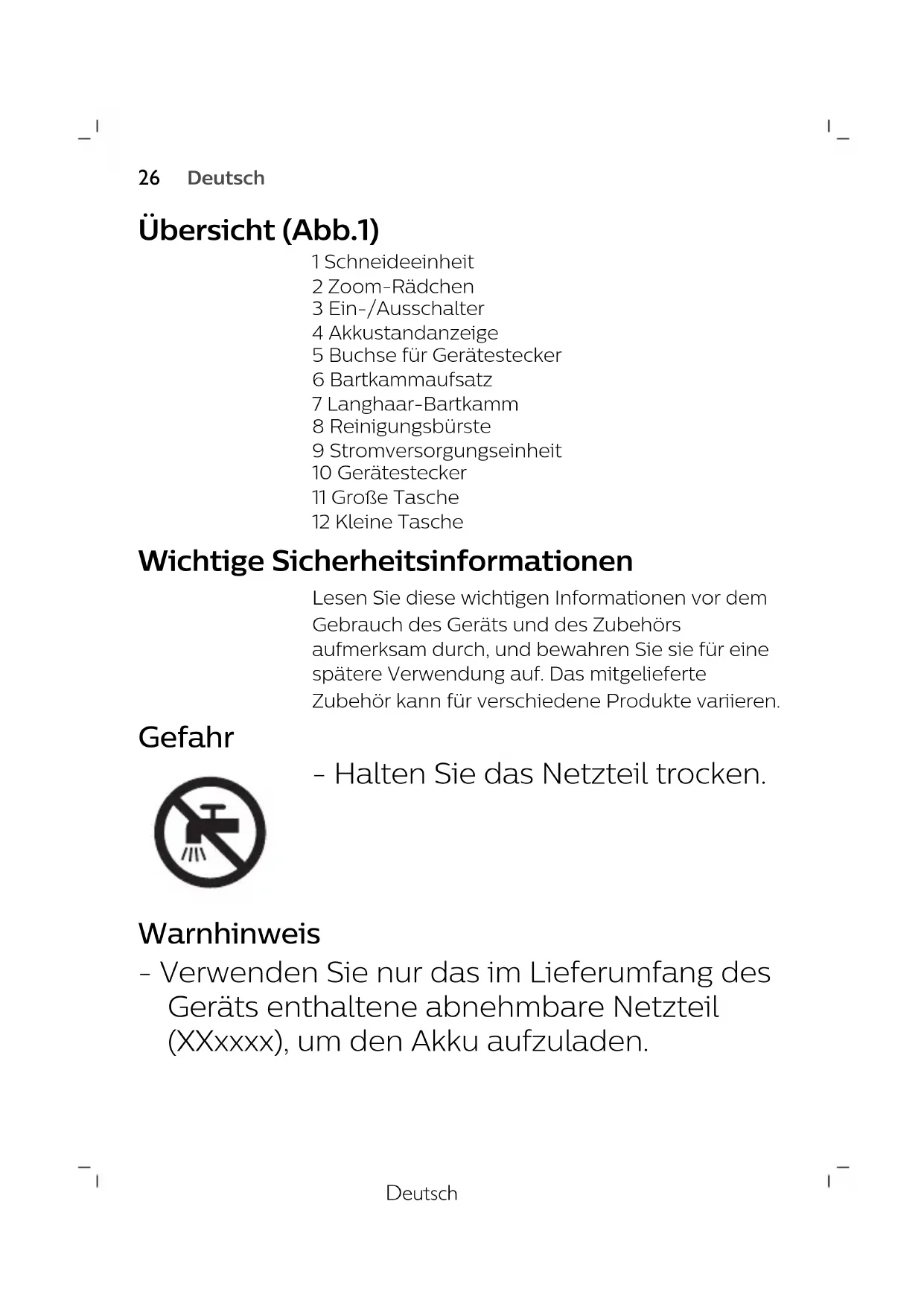 DanskDeutsch Übersicht (Abb.1) 1 Schneideeinheit 2 Zoom-Rädchen 3 Ein-/Ausschalter 4 Akkustandanzeige 5 Buchse für Gerätestecker 6 Bartkammaufsatz 7 Langhaar-Bartkamm 8 Reinigungsbürste 9 Stromversorgungseinheit 10 Gerätestecker 11 Große Tasche 12 Kleine Tasche Wichtige Sicherheitsinformationen Lesen Sie diese wichtigen Informationen vor dem Gebrauch des Geräts und des Zubehörs aufmerksam durch, und bewahren Sie sie für eine spätere Verwendung auf. Das mitgelieferte Zubehör kann für verschiedene Produkte variieren. Gefahr - Halten Sie das Netzteil trocken. Warnhinweis - Verwenden Sie nur das im Lieferumfang des Geräts enthaltene abnehmbare Netzteil (XXxxxx), um den Akku aufzuladen.
