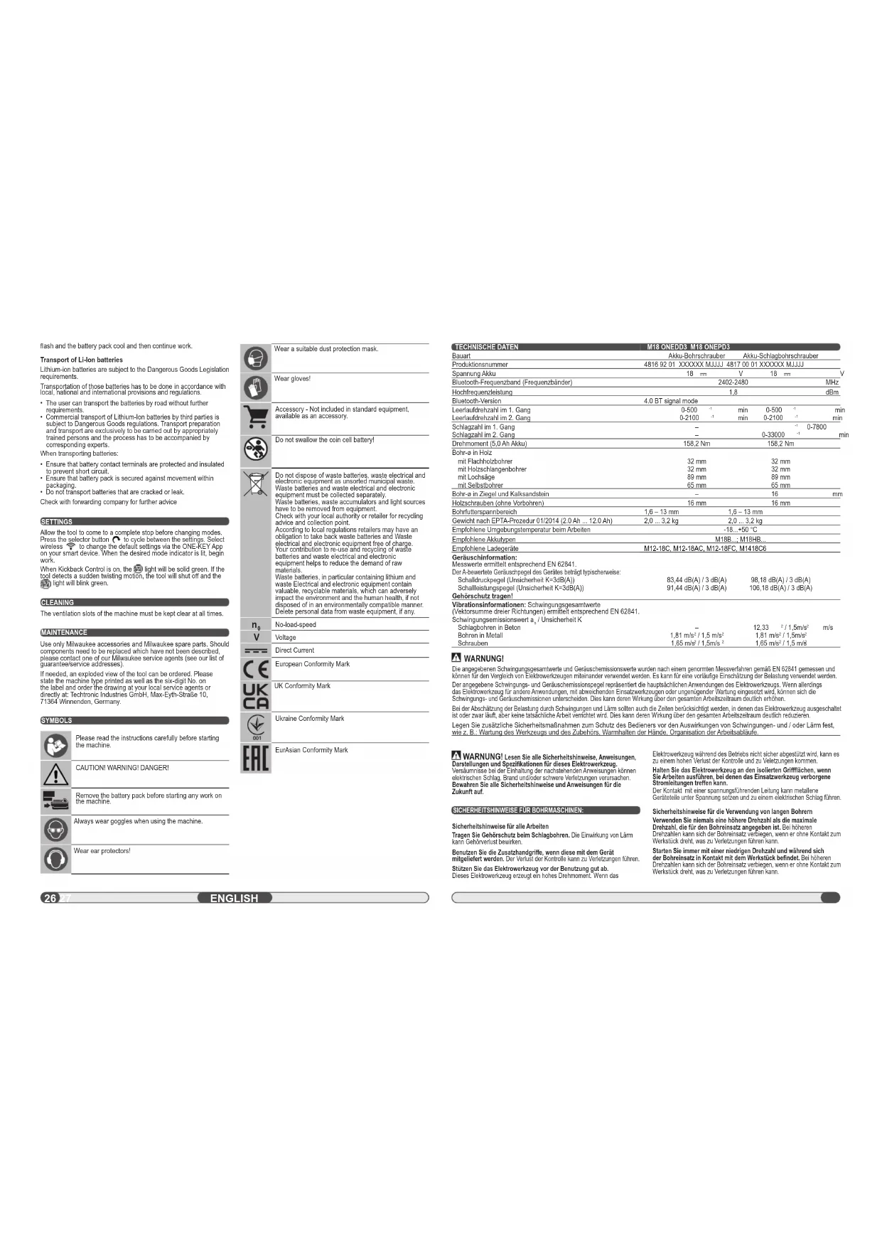 - Beschädigte oder auslaufende Akkus dürfen nicht transportiert werden. Wenden Sie sich für weitere Hinweise an Ihr Speditionsunternehmen. EINSTELLUNGEN Vor dem Ändern der Betriebsart abwarten, bis das Gerät vollkommen stillsteht. Um die Einstellungen zu ändern, die Taste drücken. Die WLAN-Taste drücken, um die voreingestellten Werte über die ONE- KEY App auf Ihrem Smartphone zu ändern. Bei eingeschalteter Rückschlagkontrolle leuchtet die Kontrollleuchte grün. Wenn das Elektrowerkzeug eine plötzliche Drehbewegung erkennt, schaltet das Elektrowerkzeug ab und die Kontrollleuchte blinkt grün. REINIGUNG Stets die Lüftungsschlitze der Maschine sauber halten. WARTUNG Nur Zubehör und Ersatzteile von Milwaukee verwenden. Bauteile, deren Austausch nicht beschrieben wurde, bei einer Milwaukee Kundendienststelle auswechseln lassen (Broschüre Garantie/Kundendienstadressen beachten). Bei Bedarf kann eine Explosionszeichnung des Gerätes unter Angabe der Maschinen Type und der sechsstelligen Nummer auf dem Leistungsschild bei Ihrer Kundendienststelle oder direkt bei Techtronic Industries GmbH, -Eyth-Straße 10, 71364 Winnenden, Germany angefordert werden. SYMBOLE Bitte lesen Sie die Gebrauchsanweisung vor Inbetriebnahme sorgfältig durch. ACHTUNG! WARNUNG! GEFAHR! Vor allen Arbeiten an der Maschine den Wechselakku herausnehmen Beim Arbeiten mit der Maschine stets Schutzbrille tragen. Gehörschutz tragen! Geeignete Staubschutzmaske tragen. Schutzhandschuhe tragen! Zubehör - Im Lieferumfang nicht enthalten, empfohlene Ergänzung aus dem Zubehörprogramm. Knopfzellenbatterie nicht verschlucken! Altbatterien, Elektro- und Elektronik-Altgeräte dürfen nicht zusammen mit dem Hausmüll entsorgt werden. Altbatterien, Elektro- und Elektronik-Altgeräte sind getrennt zu sammeln und zu entsorgen. Entfernen Sie Altbatterien, Altakkumulatorn und Leuchtmittel vor dem Entsorgen aus den Geräten. Erkundigen Sie sich bei den örtlichen Behörden oder bei Ihrem Fachhändler nach Recyclinghöfen und Sammelstellen. Je nach den örtlichen Bestimmungen können Einzelhändler verpfl ichtet sein, Altbatterien, Elektro- und Elektronik-Altgeräte kostenlos zurückzunehmen. Tragen Sie durch Wiederverwendung und Recycling Ihrer Altbatterien, Elektro- und Elektronik-Altgeräte dazu bei, den Bedarf an Rohmaterialien zu verringern. Altbatterien (vor allem Lithium-Ionen-Batterien), Elektro- und Elektronik-Altgeräte enthalten wertvolle, wiederverwertbare Materialien, die bei nicht umweltgerechter Entsorgung negative Auswirkungen auf die Umwelt und Ihre Gesundheit haben können. Löschen Sie vor der Entsorgung möglicherweise auf Ihrem Altgerät vorhandene personenbezogene Daten.