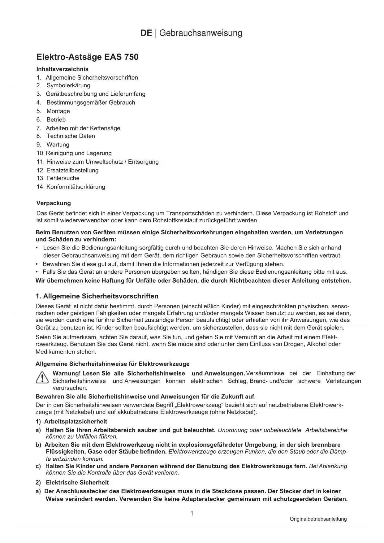 Elektro-Astsäge EAS 750 Originalbetriebsanleitung Inhaltsverzeichnis