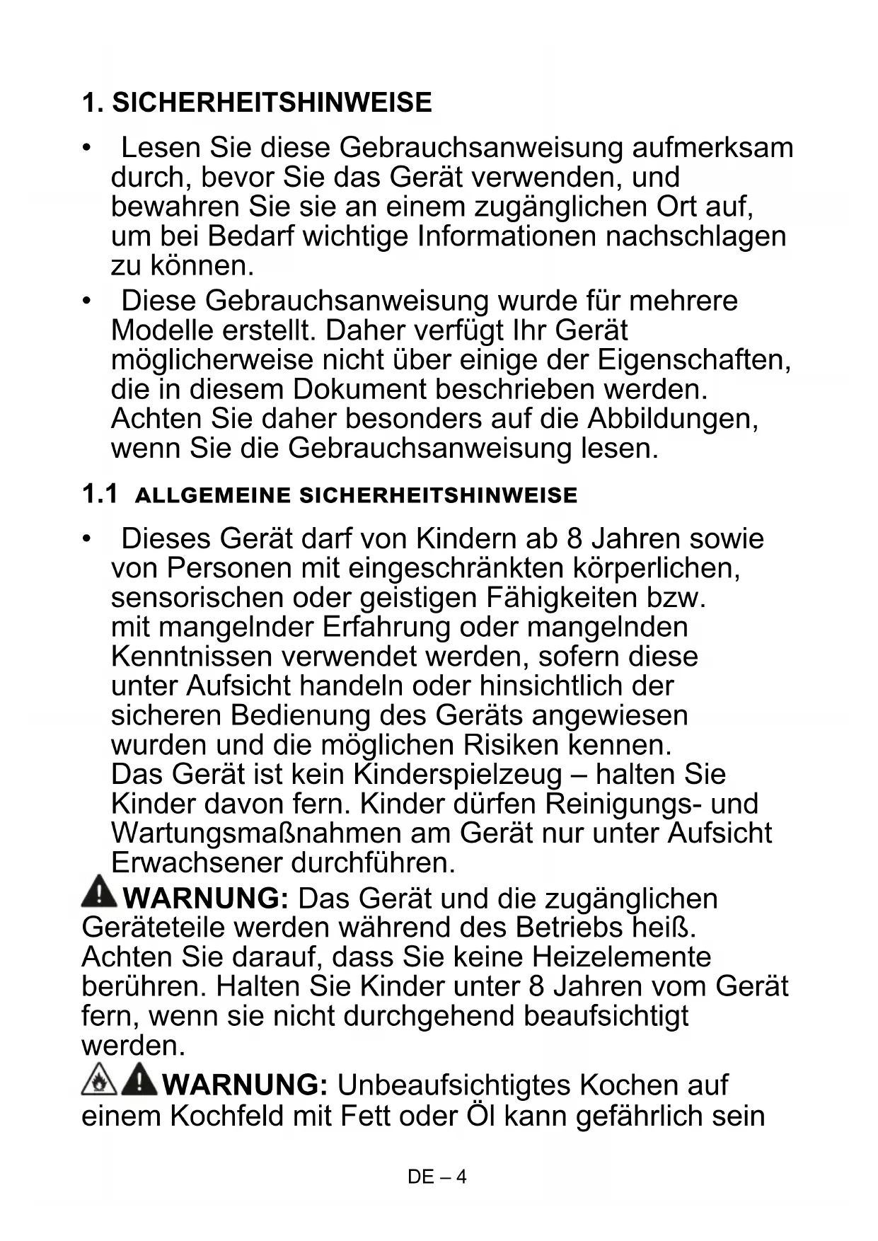 - Dieses Gerät darf von Kindern ab 8 Jahren sowie von Personen mit eingeschränkten körperlichen, sensorischen oder geistigen Fähigkeiten bzw. mit mangelnder Erfahrung oder mangelnden Kenntnissen verwendet werden, sofern diese unter Aufsicht handeln oder hinsichtlich der sicheren Bedienung des Geräts angewiesen wurden und die möglichen Risiken kennen. Das Gerät ist kein Kinderspielzeug – halten Sie Kinder davon fern. Kinder dürfen Reinigungs- und Wartungsmaßnahmen am Gerät nur unter Aufsicht Erwachsener durchführen. WARNUNG: Das Gerät und die zugänglichen Geräteteile werden während des Betriebs heiß. Achten Sie darauf, dass Sie keine Heizelemente berühren. Halten Sie Kinder unter 8 Jahren vom Gerät fern, wenn sie nicht durchgehend beaufsichtigt werden. WARNUNG: Unbeaufsichtigtes Kochen auf einem Kochfeld mit Fett oder Öl kann gefährlich seinDE – 5 und einen Brand verursachen. Versuchen Sie NIEMALS einen Brand mit Wasser zu löschen. Schalten Sie stattdessen den Herd aus, und bedecken Sie die Flamme mit einem Deckel oder einer Feuerdecke. VORSICHT: Die Garvorgang muss überwacht werden. Ein kurzfristiger Garvorgang muss ständig überwacht werden. WARNUNG: Brandgefahr:Legen Sie keine Gegenstände auf dem Kochfeld ab. WARNUNG: Hat die Oberfläche Sprünge, müssen Sie das Gerät sofort ausschalten. Es besteht Stromschlaggefahr.
