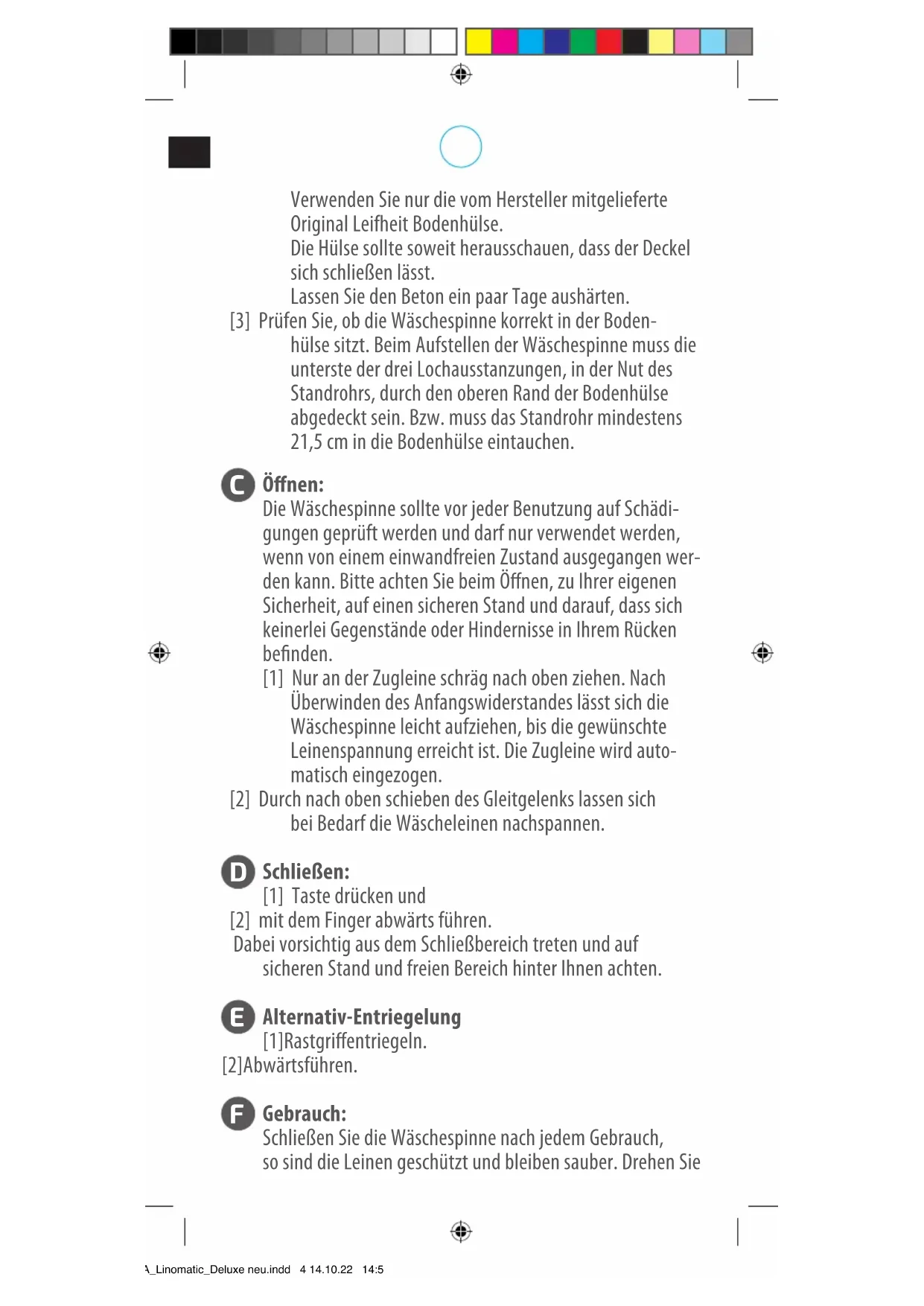 Gebrauch: Schließen Sie die Wäschespinne nach jedem Gebrauch, so sind die Leinen geschützt und bleiben sauber. Drehen Sie *BA_Linomatic_Deluxe neu.indd 4 14.10.22 14:56beim Wäscheaufhängen die Wäschespinne in der Boden- hülse, das spart Zeit und Wege. Die Wäsche nicht einseitig und nicht bei starkem Wind aufhängen.