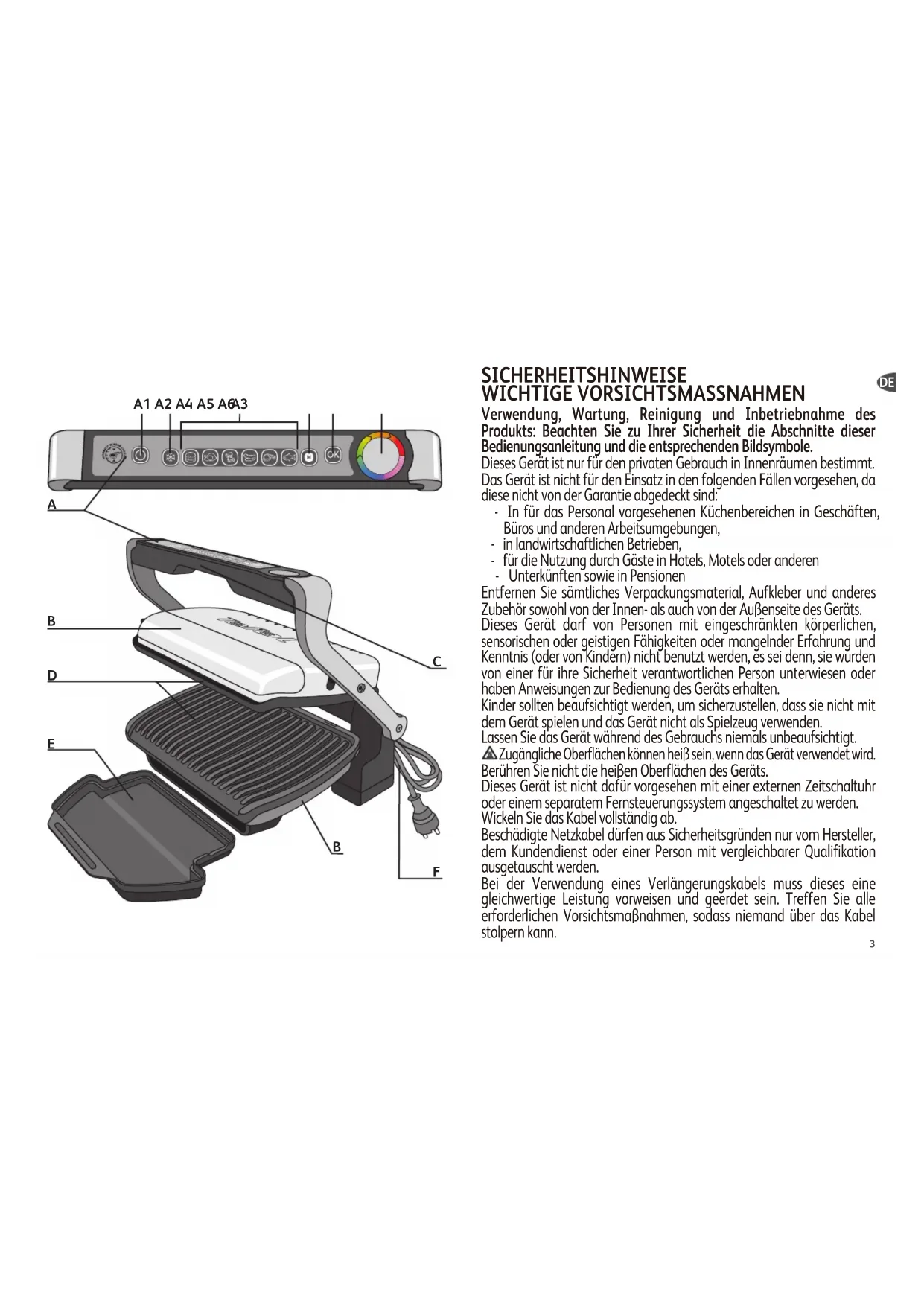 Vorwärmen Beschreibung A BedienfeldA1 Ein/Aus-TasteA2 AuftauprogrammA3 GrillprogrammeA4 Manuelles ProgrammA5 OK-TasteA6 Anzeige zur GarstufeB GerätegehäuseC GriffD HeizplattenE SaftauffangschaleF StromkabelGeflügelSandwichWürstchenSteakFischManueller Betrieb: herkömmlicher Grill für manuellen Betrieb. Übersicht Garprogramme Burger Übersicht der verschiedenen Garstufen (LED) WEIß DAUERHAFTManueller Gebrauch ausgewählt oder fehlerhafte Anwendung. Lesen Sie den Abschnitt “Störungs behebung”.WEIß BLINKENDLesen Sie den Abschnitt “Störungs behebung” (Rückgabe, Rufen des Kundendienstes...)Garstufen GELB SIGNALTON & AUFBLINKENBlutigORANGESIGNALTON & AUF BLINKENMedium ROT SIGNALTON & AUFBLINKENDurchROT BLINKENDGrillende - War mhaltefunktion startetWarmhaltefunktion (ca. 30 Min.)VIOLETT BLINKENDAufheizenVIOLETT DAUERHAFT & SIGNALTONEnde der Aufheizphase Einlegen von GrillgutAufheizen GRÜN SIGNALTON & AUFBLINKENSignalton benachrichtigt den Benutzer über die nun beginnenden Garstufen. BLAU Automatische Anpassung des GrillprogrammsBeginn des Garvorgangs8 9