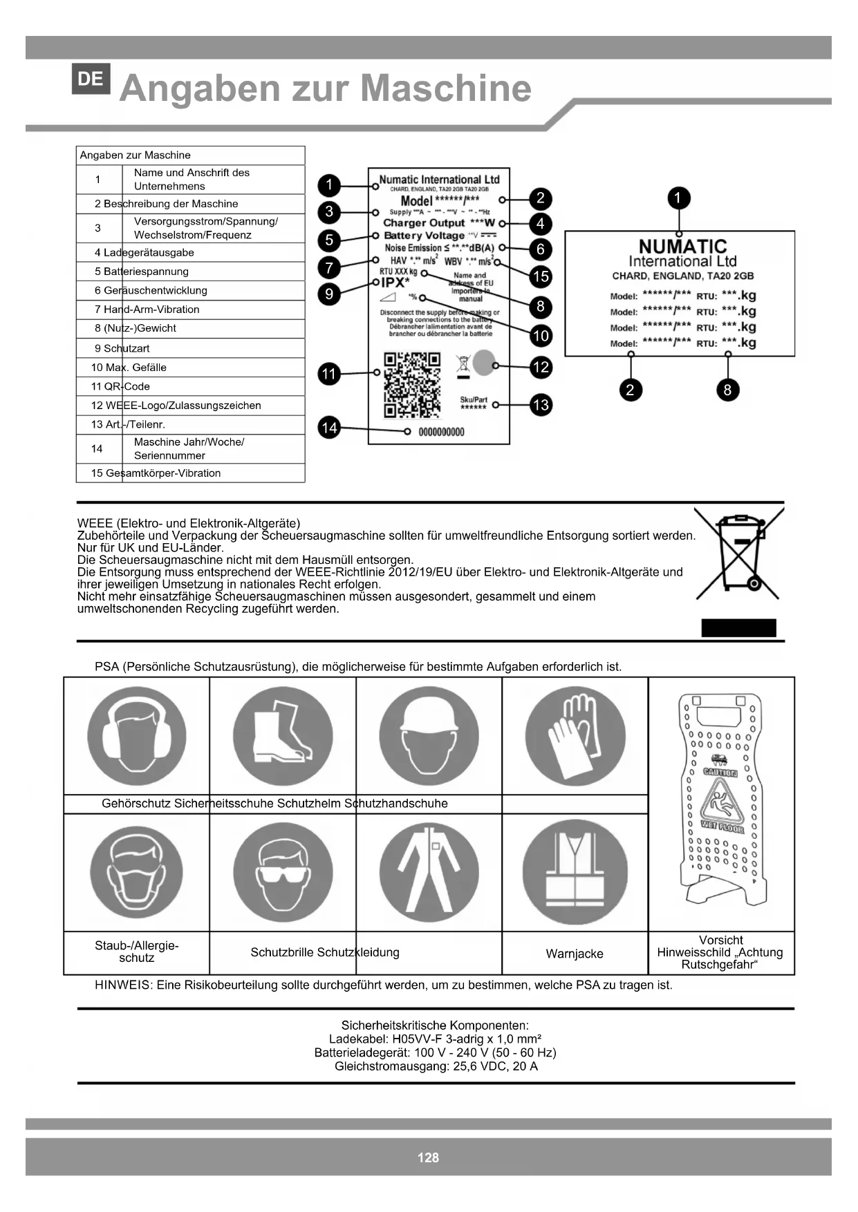 Information for Scrubber Dryer EN128 WEEE (Elektro- und Elektronik-Altgeräte) Zubehörteile und Verpackung der Scheuersaugmaschine sollten für umweltfreundliche Entsorgung sortiert werden. Nur für UK und EU-Länder. Die Scheuersaugmaschine nicht mit dem Hausmüll entsorgen. Die Entsorgung muss entsprechend der WEEE-Richtlinie 2012/19/EU über Elektro- und Elektronik-Altgeräte und ihrer jeweiligen Umsetzung in nationales Recht erfolgen. Nicht mehr einsatzfähige Scheuersaugmaschinen müssen ausgesondert, gesammelt und einem umweltschonenden Recycling zugeführt werden. Sicherheitskritische Komponenten: Ladekabel: H05VV-F 3-adrig x 1,0 mm² Batterieladegerät: 100 V - 240 V (50 - 60 Hz) Gleichstromausgang: 25,6 VDC, 20 A Angaben zur Maschine Name und Anschrift des Unternehmens2 Beschreibung der Maschine Versorgungsstrom/Spannung/Wechselstrom/Frequenz4 Ladegerätausgabe5 Batteriespannung6 Geräuschentwicklung7 Hand-Arm-Vibration8 (Nutz-)Gewicht9 Schutzart10 Max. Gefälle11 QR-Code12 WEEE-Logo/Zulassungszeichen13 Art.-/Teilenr. Maschine Jahr/Woche/Seriennummer15 Gesamtkörper-Vibration Gehörschutz Sicherheitsschuhe Schutzhelm Schutzhandschuhe Staub-/Allergie- schutz Schutzbrille Schutzkleidung Warnjacke Vorsicht Hinweisschild „Achtung Rutschgefahr“ PSA (Persönliche Schutzausrüstung), die möglicherweise für bestimmte Aufgaben erforderlich ist. HINWEIS: Eine Risikobeurteilung sollte durchgeführt werden, um zu bestimmen, welche PSA zu tragen ist.