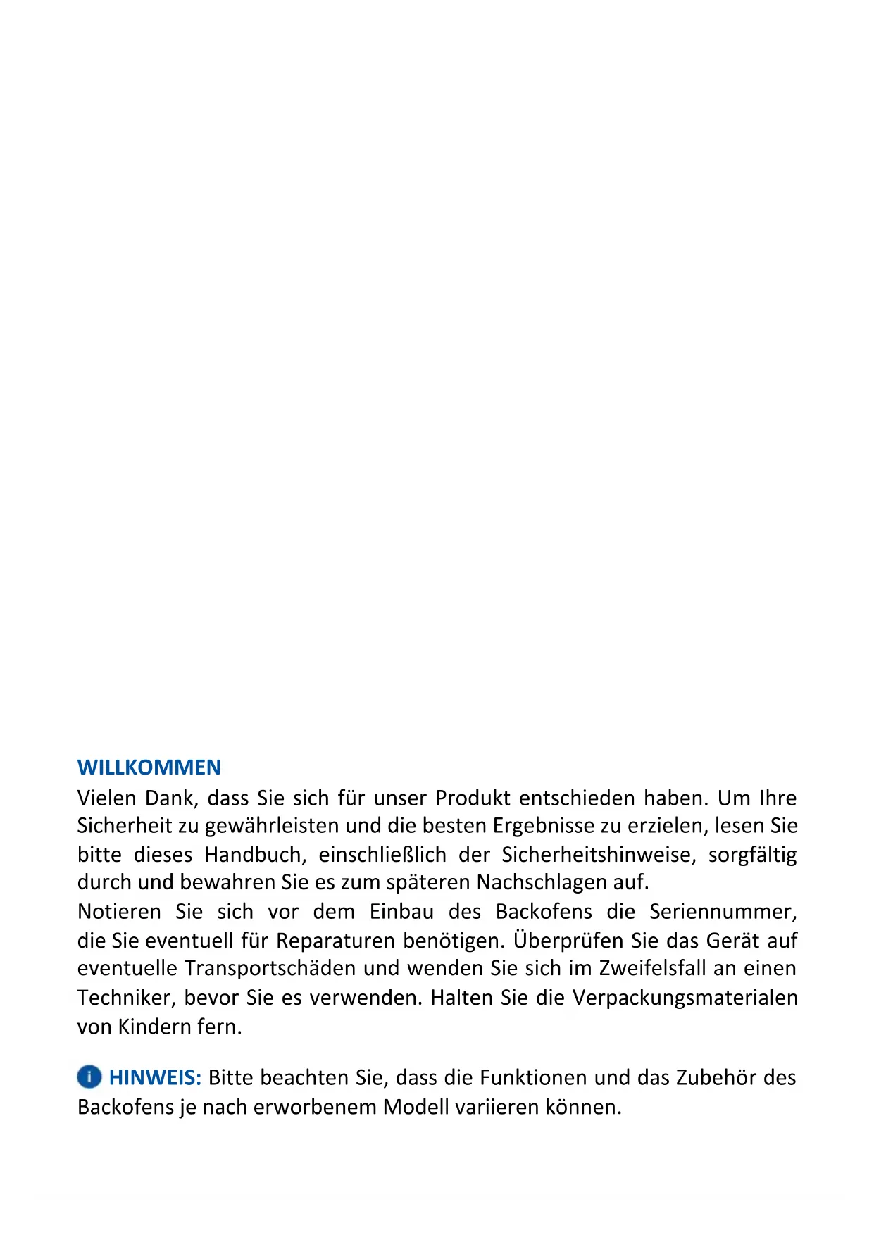 OPPURE Ammortizzatore Ammortizzatore mmWILLKOMMEN Vielen Dank, dass Sie sich für unser Produkt entschieden haben. Um Ihre Sicherheit zu gewährleisten und die besten Ergebnisse zu erzielen, lesen Sie bitte dieses Handbuch, einschließlich der Sicherheitshinweise, sorgfältig durch und bewahren Sie es zum späteren Nachschlagen auf. Notieren Sie sich vor dem Einbau des Backofens die Seriennummer, die Sie eventuell für Reparaturen benötigen. Überprüfen Sie das Gerät auf eventuelle Transportschäden und wenden Sie sich im Zweifelsfall an einen Techniker, bevor Sie es verwenden. Halten Sie die Verpackungsmaterialen von Kindern fern. HINWEIS: Bitte beachten Sie, dass die Funktionen und das Zubehör des Backofens je nach erworbenem Modell variieren können.ZUSAMMENFASSUNG