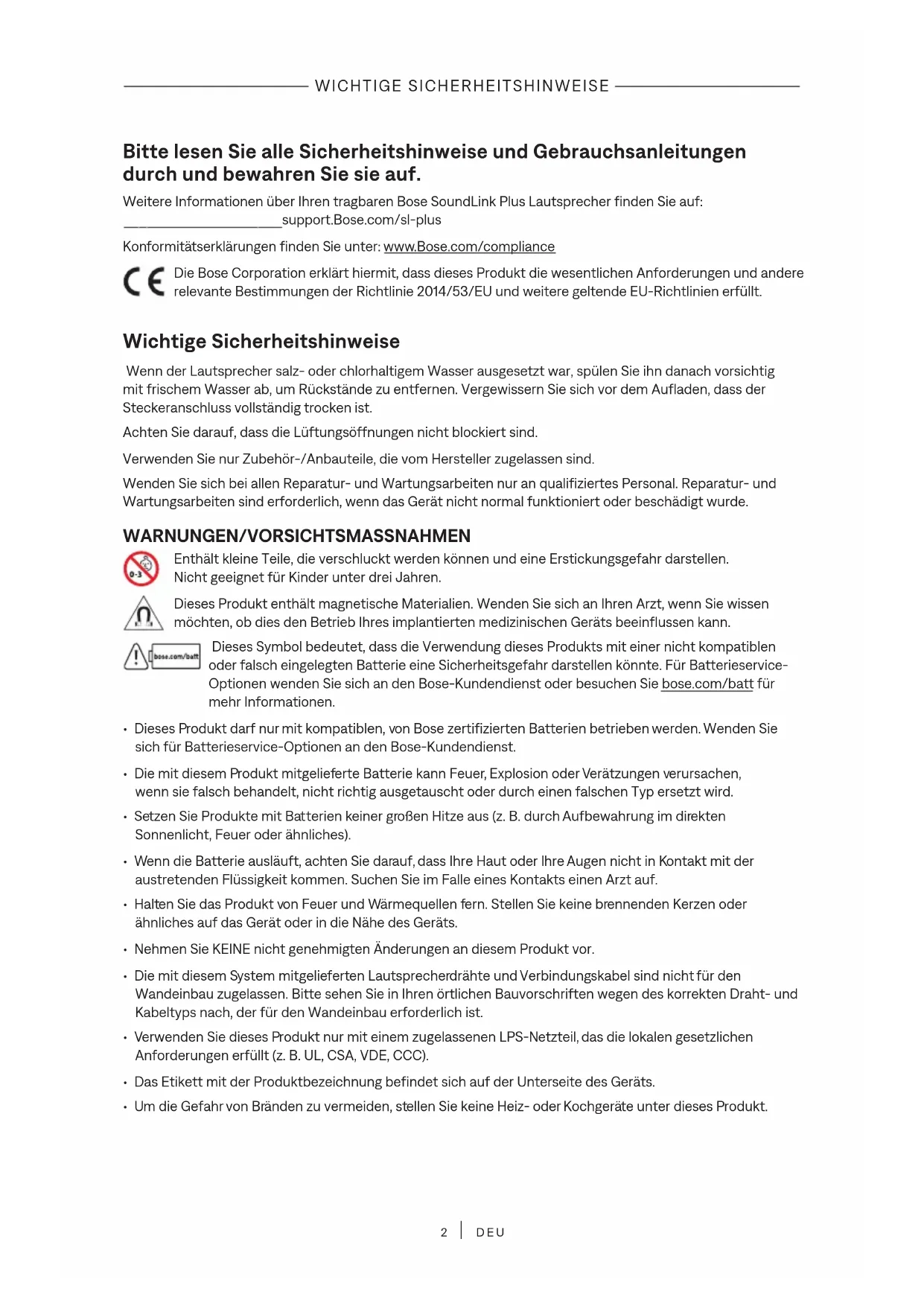 DEU Bitte lesen Sie alle Sicherheitshinweise und Gebrauchsanleitungen durch und bewahren Sie sie auf. Weitere Informationen über Ihren tragbaren Bose SoundLink Plus Lautsprecher finden Sie auf: support.Bose.com/sl-plussupport.Bose.com/sl-plus Konformitätserklärungen finden Sie unter: www.Bose.com/compliancewww.Bose.com/compliance Die Bose Corporation erklärt hiermit, dass dieses Produkt die wesentlichen Anforderungen und andere relevante Bestimmungen der Richtlinie 2014/53/EU und weitere geltende EU-Richtlinien erfüllt. Wichtige Sicherheitshinweise Wenn der Lautsprecher salz- oder chlorhaltigem Wasser ausgesetzt war, spülen Sie ihn danach vorsichtig mit frischem Wasser ab, um Rückstände zu entfernen. Vergewissern Sie sich vor dem Aufladen, dass der Steckeranschluss vollständig trocken ist. Achten Sie darauf, dass die Lüftungsöffnungen nicht blockiert sind. Verwenden Sie nur Zubehör-/Anbauteile, die vom Hersteller zugelassen sind. Wenden Sie sich bei allen Reparatur- und Wartungsarbeiten nur an qualifiziertes Personal. Reparatur- und Wartungsarbeiten sind erforderlich, wenn das Gerät nicht normal funktioniert oder beschädigt wurde. WARNUNGEN/VORSICHTSMASSNAHMEN Enthält kleine Teile, die verschluckt werden können und eine Erstickungsgefahr darstellen. Nicht geeignet für Kinder unter drei Jahren. Dieses Produkt enthält magnetische Materialien. Wenden Sie sich an Ihren Arzt, wenn Sie wissen möchten, ob dies den Betrieb Ihres implantierten medizinischen Geräts beeinflussen kann. Dieses Symbol bedeutet, dass die Verwendung dieses Produkts mit einer nicht kompatiblen oder falsch eingelegten Batterie eine Sicherheitsgefahr darstellen könnte. Für Batterieservice- Optionen wenden Sie sich an den Bose-Kundendienst oder besuchen Sie bose.com/batt für mehr Informationen.