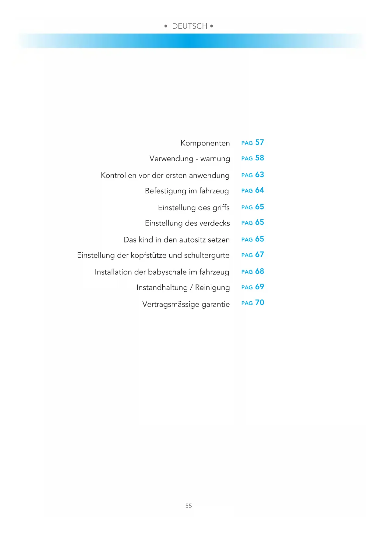 GARANTIE CONVENTIONNELLE pag 57 pag 58 pag 63 pag 64 pag 65 pag 65 pag 65 pag 67 pag 68 pag 69 pag 70 Komponenten Verwendung - warnung Kontrollen vor der ersten anwendung Befestigung im fahrzeug Einstellung des griffs Einstellung des verdecks Das kind in den autositz setzen Einstellung der kopfstütze und schultergurte Installation der babyschale im fahrzeug Instandhaltung / Reinigung Vertragsmässige garantie• DEUTSCH • • DEUTSCH •