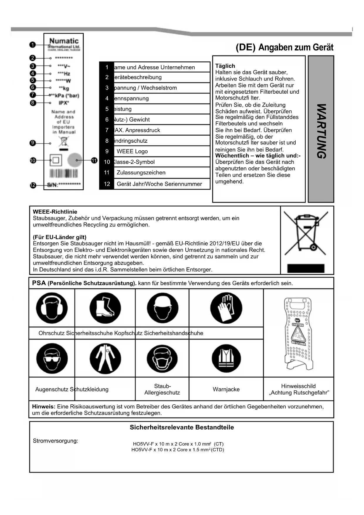 - Use defoamer if necessary. Use of detergents When using any detergent with this machine, please ensure you have read the safety data on the container and you are familiar with the procedures to clear up spills, inhalation, skin and eye contact. Dry Mode maintenance/fault fi nding If the vacuum cleaner stops working switch o and remove the plug from the power supply before investigating were the fault lies. If the vacuum cleaner will not pick up any debris from the surface, switch o and remove the plug from the power supply, inspect the oor tool, wands and hose for blockages, if no blockages are found, the dust bag may be full if the dust bag is not full the lter may be blocked. Wet mode / Spray extraction maintenance/fault fi nding If the vacuum cleaner stops working switch o and remove the plug from the power supply before investigating were the fault lies. If the vacuum cleaner has a blockage and will not pick up liquid, switch o and remove the plug from the power supply, has the oat valve operated, this will shut o the suction and the pitch of the vacuum motor will change. Remove the power head and empty the liquid out of the container, if the container is empty, check that the oor tool wands and hose are not blocked. If the spray nozzle is blocked a pin maybe used to clear the blockage. No spray from nozzle and the pump tone changes, the solution tank is empty, re ll the solution tank. Flush the system with clean water after use. After use always inspect the machine for damage.PSA (Persönliche Schutzausrüstung). kann für bestimmte Verwendung des Geräts erforderlich sein. Ohrschutz Sicherheitsschuhe Kopfschutz Sicherheitshandschuhe Augenschutz Schutzkleidung Staub- Allergieschutz Warnjacke Hinweisschild „Achtung Rutschgefahr” Hinweis: Eine Risikoauswertung ist vom Betreiber des Gerätes anhand der örtlichen Gegebenheiten vorzunehmen, um die erforderliche Schutzausrüstung festzulegen. Sicherheitsrelevante Bestandteile Stromversorgung: WEEE-Richtlinie Staubsauger, Zubehör und Verpackung müssen getrennt entsorgt werden, um ein umweltfreundliches Recycling zu ermöglichen. (Für EU-Länder gilt) Entsorgen Sie Staubsauger nicht im Hausmüll! - gemäß EU-Richtlinie 2012/19/EU über die Entsorgung von Elektro- und Elektronikgeräten sowie deren Umsetzung in nationales Recht. Staubsauer, die nicht mehr verwendet werden können, sind getrennt zu sammeln und zur umweltfreundlichen Entsorgung abzugeben. In Deutschland sind das i.d.R. Sammelstellen beim örtlichen Entsorger. Täglich Halten sie das Gerät sauber, inklusive Schlauch und Rohren. Arbeiten Sie mit dem Gerät nur mit eingesetztem Filterbeutel und Motorschutz lter. Prüfen Sie, ob die Zuleitung Schäden aufweist. Überprüfen Sie regelmäßig den Füllstanddes Filterbeutels und wechseln Sie ihn bei Bedarf. Überprüfen Sie regelmäßig, ob der Motorschutz lter sauber ist und reinigen Sie ihn bei Bedarf. Wöchentlich – wie täglich und:- Überprüfen Sie das Gerät nach abgenutzten oder beschädigten Teilen und ersetzen Sie diese umgehend. WARTUNG (DE) Angaben zum Gerät 1 Name und Adresse Unternehmen 2 Gerätebeschreibung 3 Spannung / Wechselstrom 4 Nennspannung 5 Leistung 6 (Nutz-) Gewicht 7 MAX. Anpressdruck 8 Eindringschutz