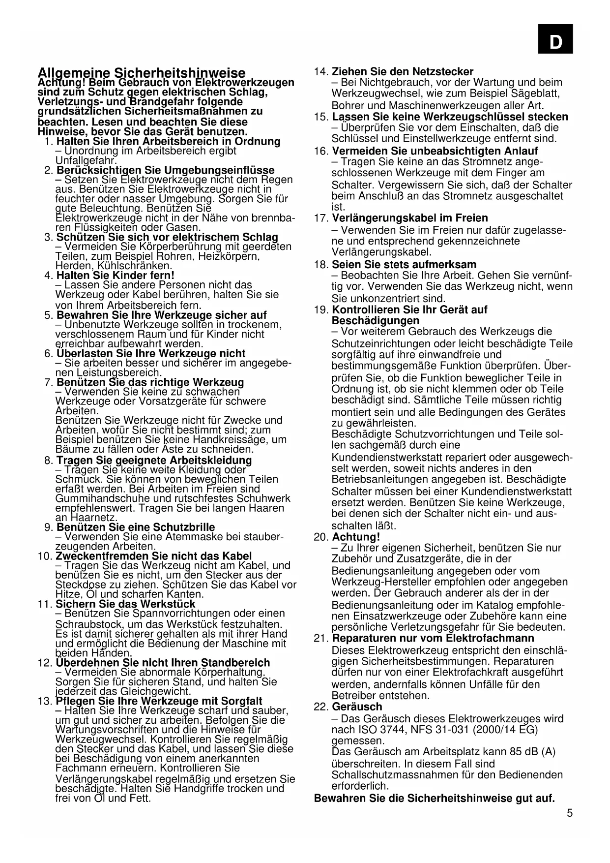 – Das Geräusch dieses Elektrowerkzeuges wird nach ISO 3744, NFS 31-031 (2000/14 EG) gemessen. Das Geräusch am Arbeitsplatz kann 85 dB (A) überschreiten. In diesem Fall sind Schallschutzmassnahmen für den Bedienenden erforderlich. Bewahren Sie die Sicherheitshinweise gut auf.6