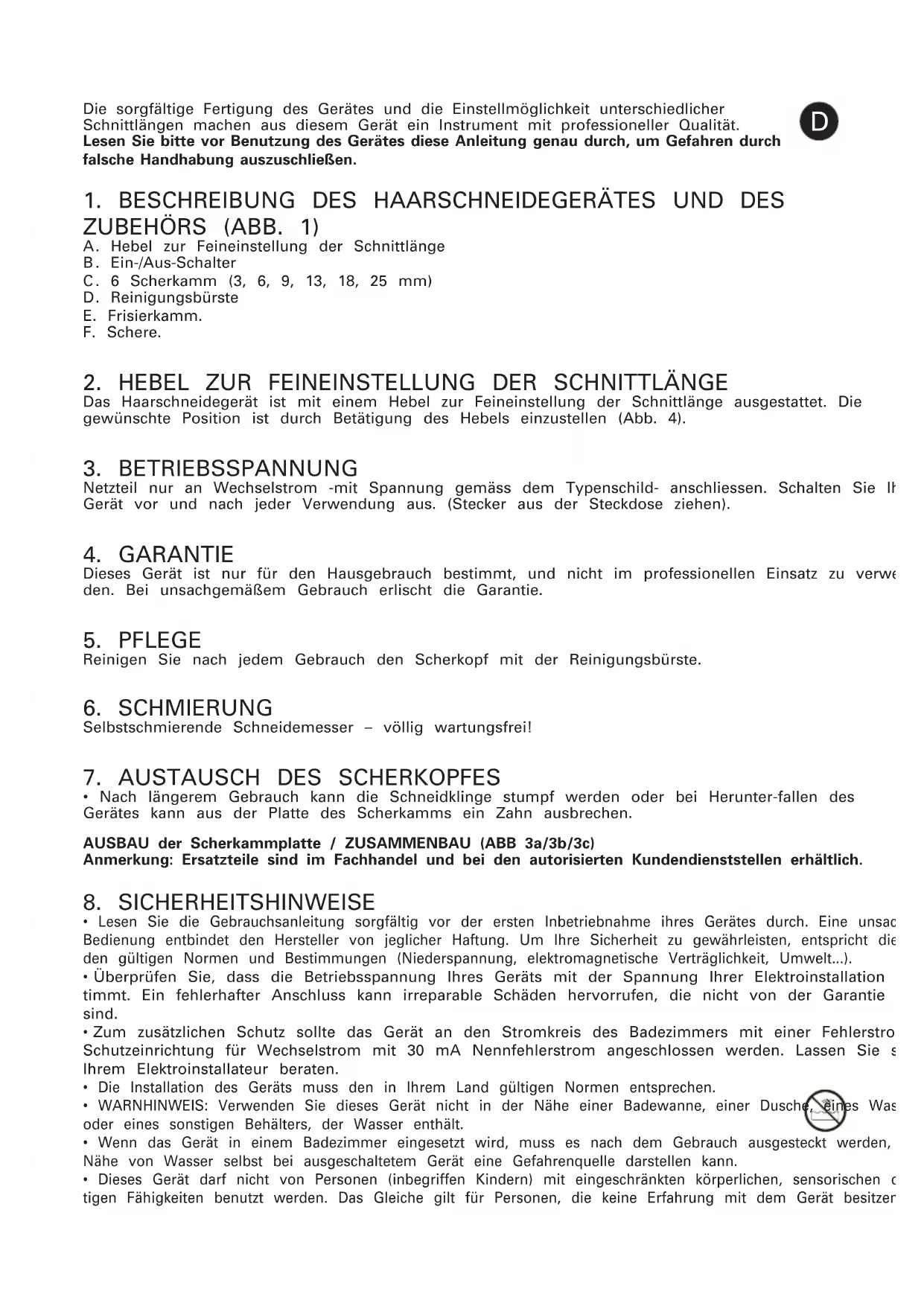 1. BESCHREIBUNG DES HAARSCHNEIDEGERÄTES UND DES