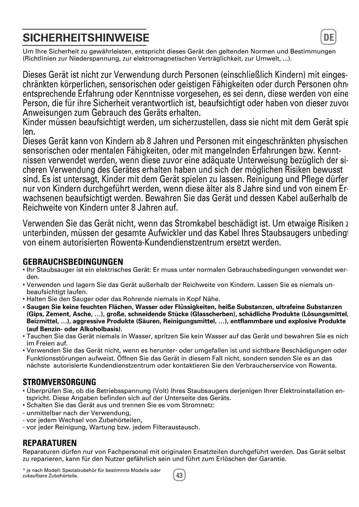 SICHERHEITSHINWEISE Um Ihre Sicherheit zu gewährleisten, entspricht dieses Gerät den geltenden Normen und Bestimmungen (Richtlinien zur Niederspannung, zur elektromagnetischen Verträglichkeit, zur Umwelt, ...). Dieses Gerät ist nicht zur Verwendung durch Personen (einschließlich Kindern) mit einges- chränkten körperlichen, sensorischen oder geistigen Fähigkeiten oder durch Personen ohne entsprechende Erfahrung oder Kenntnisse vorgesehen, es sei denn, diese werden von einer Person, die für ihre Sicherheit verantwortlich ist, beaufsichtigt oder haben von dieser zuvor Anweisungen zum Gebrauch des Geräts erhalten. Kinder müssen beaufsichtigt werden, um sicherzustellen, dass sie nicht mit dem Gerät spie- len. Dieses Gerät kann von Kindern ab 8 Jahren und Personen mit eingeschränkten physischen, sensorischen oder mentalen Fähigkeiten, oder mit mangelnden Erfahrungen bzw. Kennt- nissen verwendet werden, wenn diese zuvor eine adäquate Unterweisung bezüglich der si- cheren Verwendung des Gerätes erhalten haben und sich der möglichen Risiken bewusst sind. Es ist untersagt, Kinder mit dem Gerät spielen zu lassen. Reinigung und Pflege dürfen nur von Kindern durchgeführt werden, wenn diese älter als 8 Jahre sind und von einem Er- wachsenen beaufsichtigt werden. Bewahren Sie das Gerät und dessen Kabel außerhalb der Reichweite von Kindern unter 8 Jahren auf. Verwenden Sie das Gerät nicht, wenn das Stromkabel beschädigt ist. Um etwaige Risiken zu unterbinden, müssen der gesamte Aufwickler und das Kabel Ihres Staubsaugers unbedingt von einem autorisierten Rowenta-Kundendienstzentrum ersetzt werden. GEBRAUCHSBEDINGUNGEN