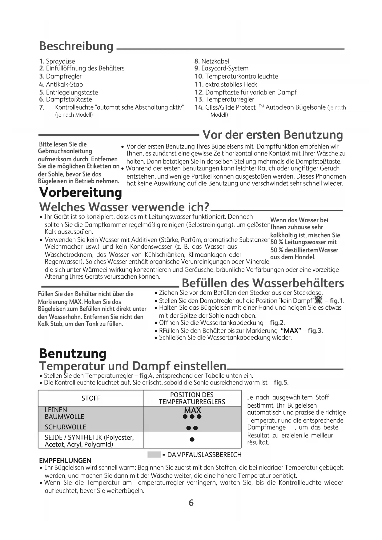 - Wenn Sie die Temperatur am Temperaturregler verringern, warten Sie, bis die Kontrollleuchte wieder aufleuchtet, bevor Sie weiterbügeln. Bitte lesen Sie die Gebrauchsanleitung aufmerksam durch. Entfernen Sie die möglichen Etiketten an der Sohle, bevor Sie das Bügeleisen in Betrieb nehmen. Füllen Sie den Behälter nicht über die Markierung MAX. Halten Sie das Bügeleisen zum Befüllen nicht direkt unter den Wasserhahn. Entfernen Sie nicht den Kalk Stab, um den Tank zu füllen. Wenn das Wasser bei Ihnen zuhause sehr kalkhaltig ist, mischen Sie 50 % Leitungswasser mit 50 % destilliertemWasser aus dem Handel. = DAMPFAUSLASSBEREICH STOFF POSITION DES TEMPERATURREGLERS LEINEN BAUMWOLLE SCHURWOLLE SEIDE / SYNTHETIK (Polyester, Acetat, Acryl, Polyamid) MAX