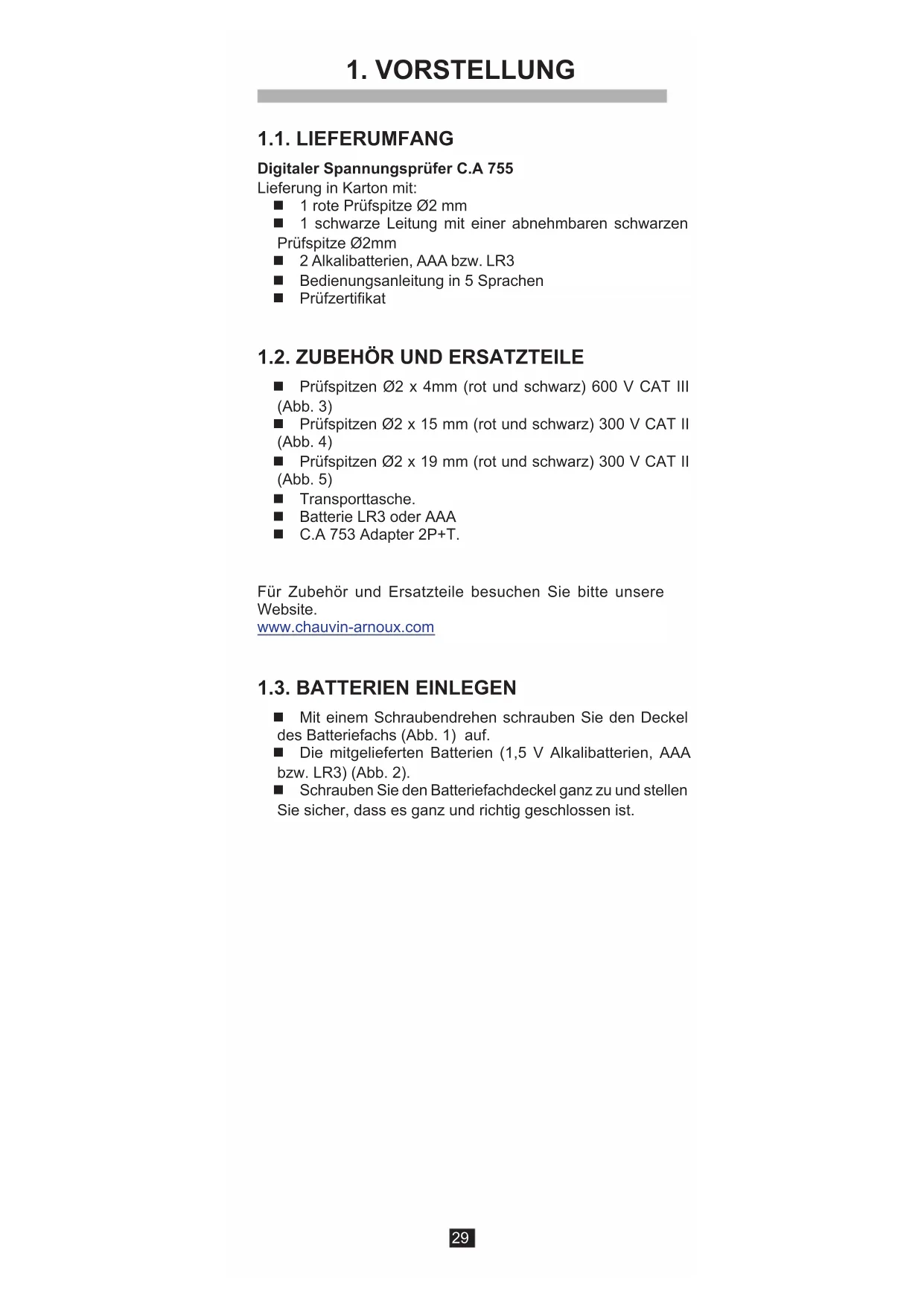 1.1. LIEFERUMFANG Digitaler Spannungsprüfer C.A 755 Lieferung in Karton mit: 1 rote Prüfspitze Ø2 mm 1 schwarze Leitung mit einer abnehmbaren schwarzen Prüfspitze Ø2mm 2 Alkalibatterien, AAA bzw. LR3 Bedienungsanleitung in 5 Sprachen Prüfzertikat