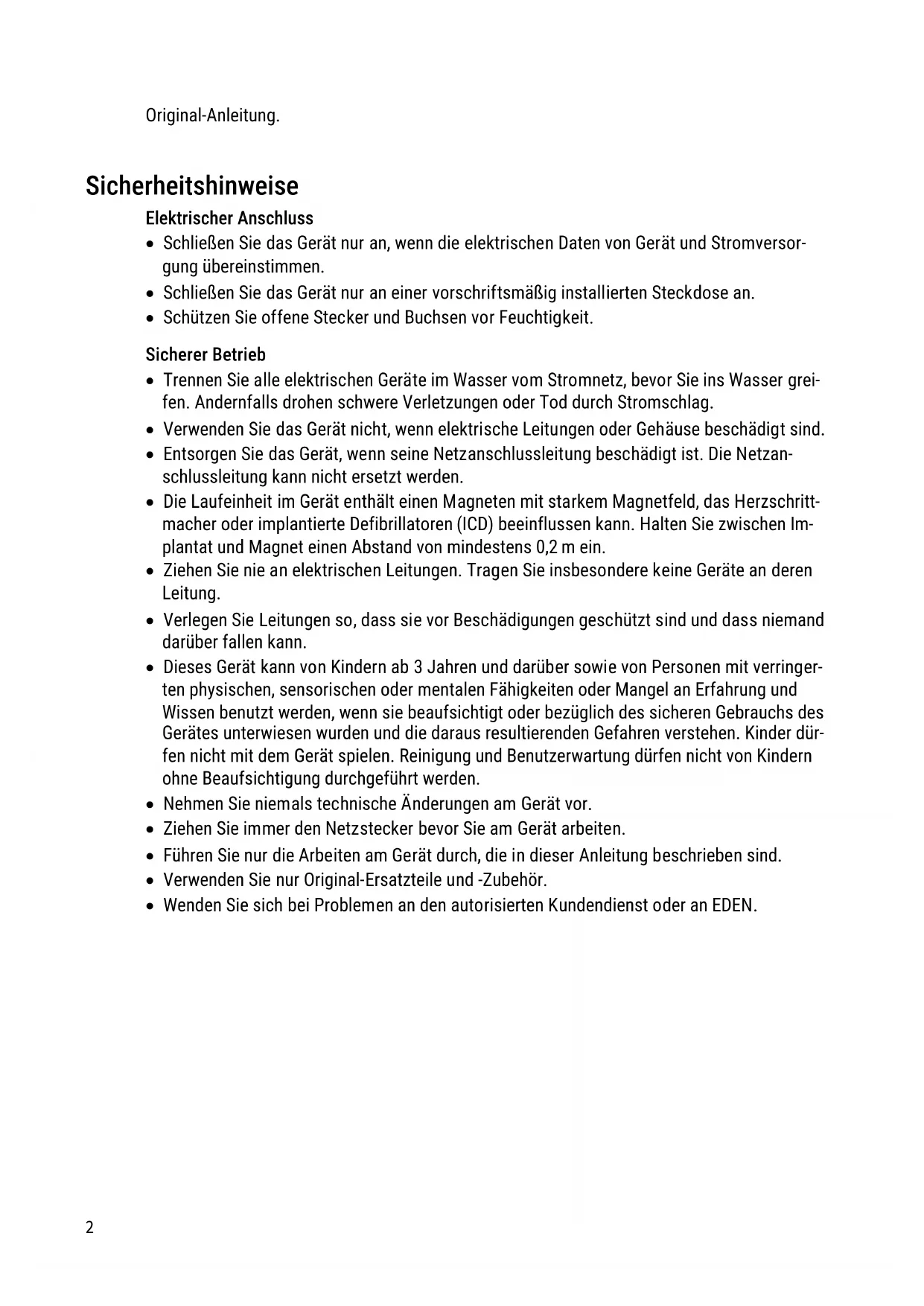 - Wenden Sie sich bei Problemen an den autorisierten Kundendienst oder an EDEN.DE